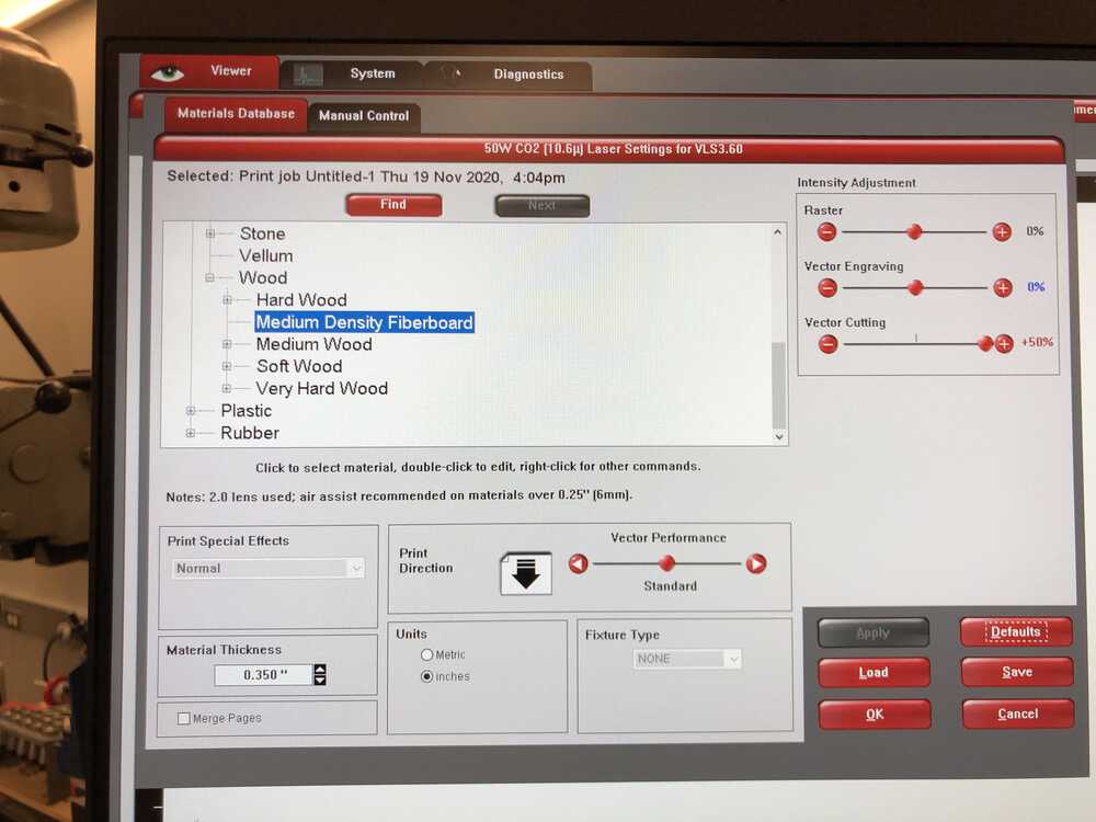 I had to do a handful of test cuts with the MDF because the preset options weren't strong enough to get through this horrid material - the true thickness was 0.25 inches but I had to up it to 0.35 to get it to make it through to the other side.