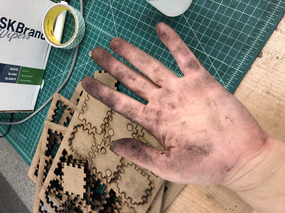 For my project I need a box for each circuit board to live in, with spaces for magnets to connect the boxes and create connections between the microcontrollers so they can create a network and display the right number on their OLED. I ended up using some MDF which I thought would make a sturdy box and would support the magnets and be paintable to look kid-friendly. Unfortunately it was a nightmare to cut through...