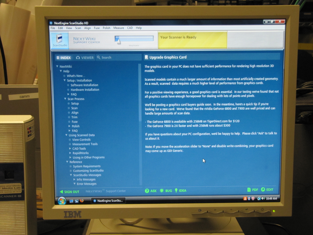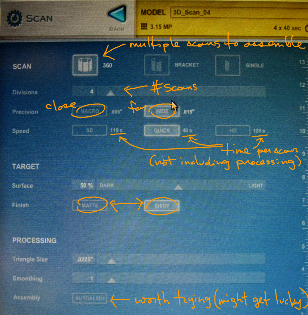 If you want to use this tool, I highly recommend opening the software, looking at the index on the left hand column (blue), and going to NextWiki->Help->Training and watching the webinar that shows up in the right hand pane ("Introduction to NextEngine ScanStudio"). You might need to refresh the window to get the video to play properly (just minimize and remaximize the window).