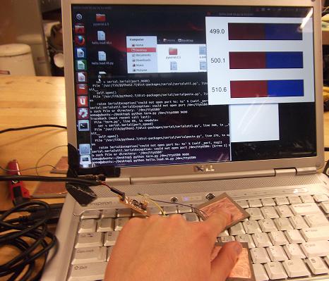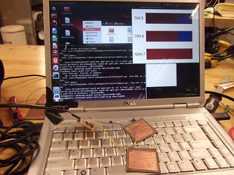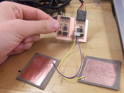 This was a straightforward task - I chose to make Neil's step-response board (hello.load.45.c) that would measure the capacitance between two copper pads, indicating whether someone was touching them or not.
