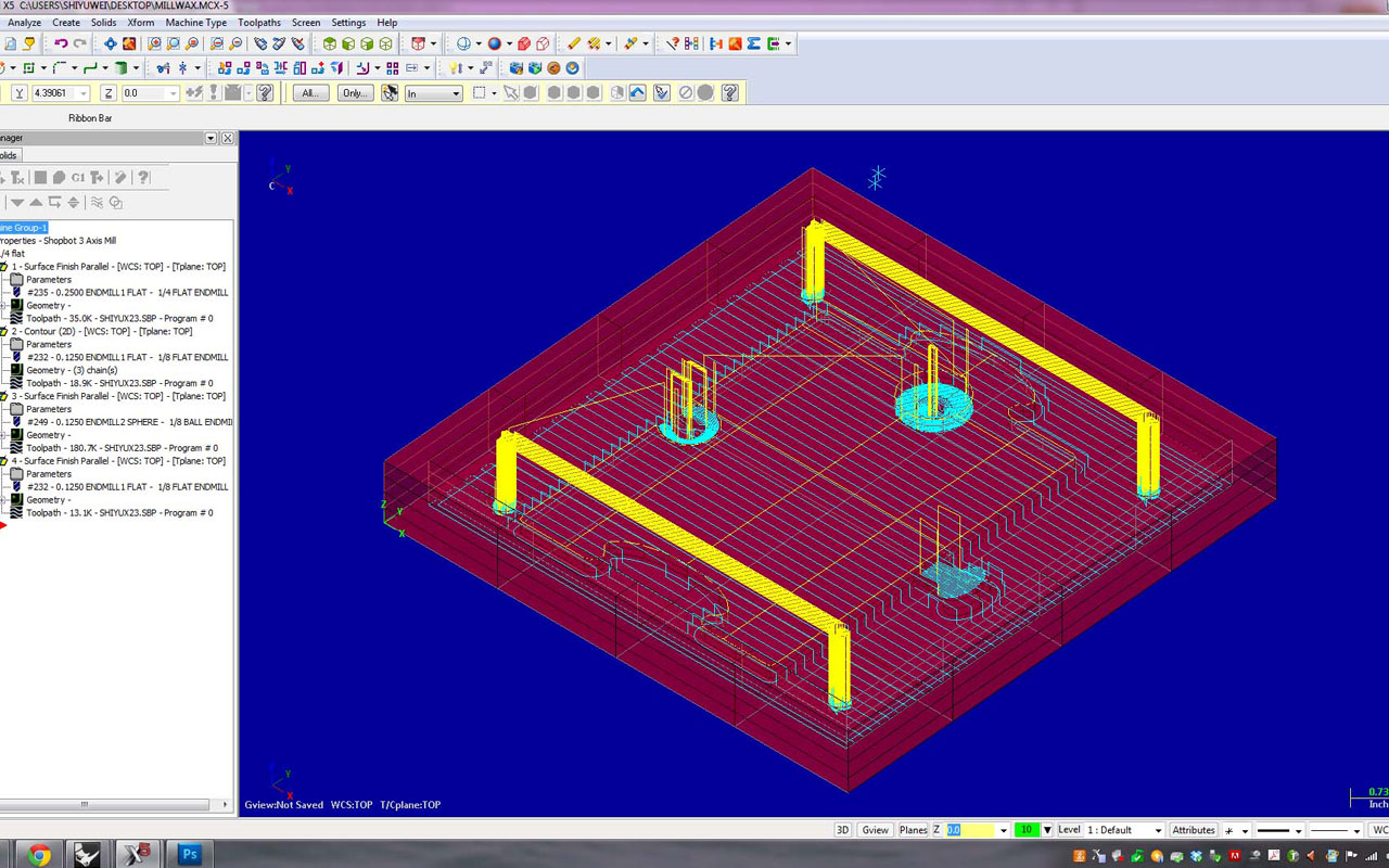 I used MasterCam to set up the milling file. A couple of things learned - to make sure a surface is not accidentally taken; you can do "check surface" to pretect it.