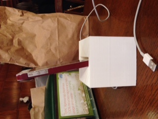 I had a few ideas about the iphone holder, but I chose to do a box because it was simple and easy to design. I started drawing the design on Monday afternoon. I would have holes to direct the sound waves better and have a convenient phone charger while holding the phone up straight. I began printing the gigantic iphone holder, but the estimated time was 10hrs. I used makerbot 2. BE SURE to center the 3D Model. I went ahead as I started at 1:00am. At 8:00am, the wire connection had a problem.