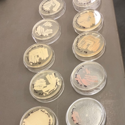 Most of the plates had multiple colors and/or morphologies of microbes. We used pipette tips to sample as many different, unique microbes as we could determine from color and morphology, and grew the samples on new selective YPD plates (Reagent A). In order to get single colonies (a mass of genetically-identical microbes that divided from a single microbe), we used the streaking technique. Incubation at 30C for 24 hours was sufficient for most of the microbes to grow into decently-sized colonies; the pink yeast showed slower growth.