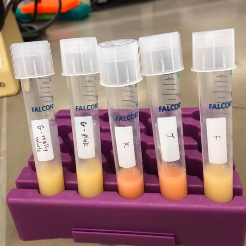 We first attempted to test for CO2 production by culturing the yeast colonies in liquid YPD broth and securing balloons over the mouths of the culture tubes, then incubating on a spinner at 30C. Yeast is a microscopic fungus that converts sugar into carbon dioxide. The generated CO2 gas should fill the tube and then fill the balloon as more gas is created. There was no obvious inflation of the balloon; however, because the positive control, baker’s yeast, also did not yield inflation of the balloon, it is possible the methodology was faulty.