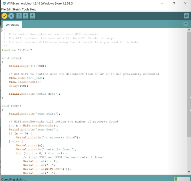 Using the jumper wire, I fixed the problem and ran the existing example code provided by Arduino, Wifi Scan.