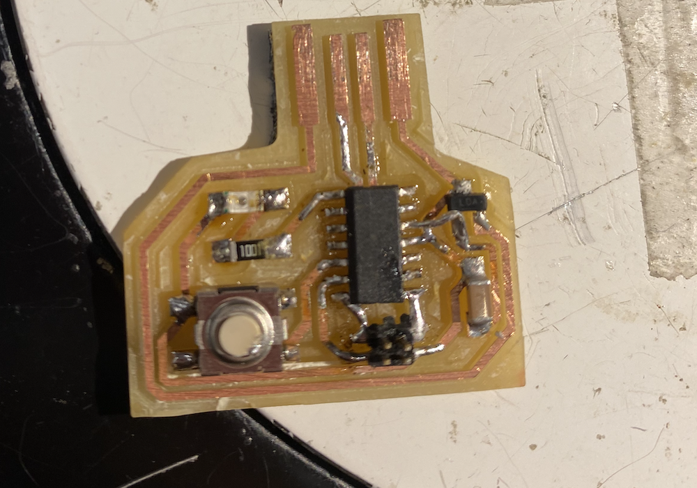 To check if the board was working, we used some simple blink code that Rob had to check if things worked. At first, the light didn't work. After some voltage testing, we saw that the voltage to the resistor was actually correctly fluctuating between 0 and ~2.5-3 volts. We thought the LED I used was an infrared LED, so I swapped it out for a blue LED. After swapping it out, it successfully blinked and everything was finally ready to be programmed!