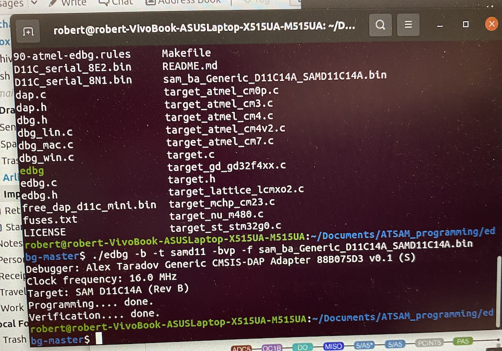 To figure out if it was an issue with my board or not, I tried using edbg to program a board I knew worked. However, edbg kept failing and having software issues. The descriptions of the errors were very vague (always just invalid error), so I had no idea if it was hardware or software.