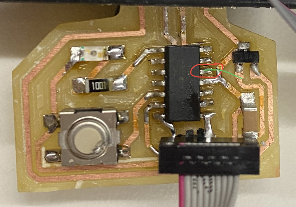 Rob used the multimeter to check voltages and connections between traces. This was super helpful, since we eventually found out that my SamD11 chip wasn't actually connected to power. After looking at my week 6 documentation, I realized I forgot to put that trace in my schema. To fix it, we added in a wire to pin 12 and the output of my VCC regulator. Rob helped me solder on the wire to connect my chip to power, and we were able to use Rob's Linux edbg installation to successfully bootload!