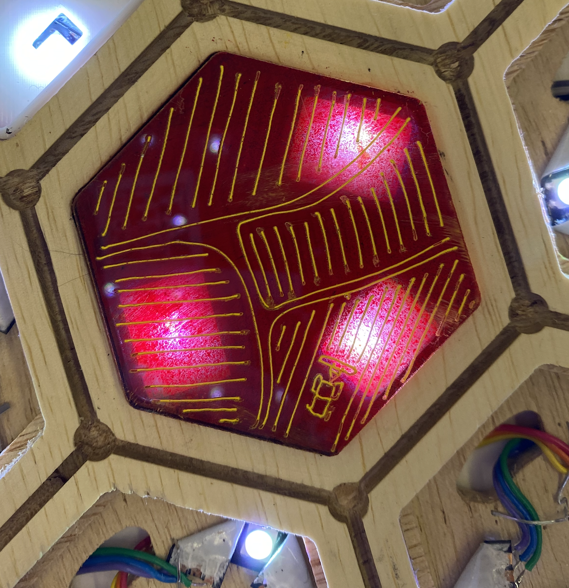 Randomizing the neopixels took a lot of time and troubleshooting. I created various dictionaries to store the color information, deal with randomization of placements, etc. I had an issue where my dictionary was missing an element, which threw off all my Neopixel displays. Here, you can see how there are multiple dark hexagons when there are only supposed to be one: