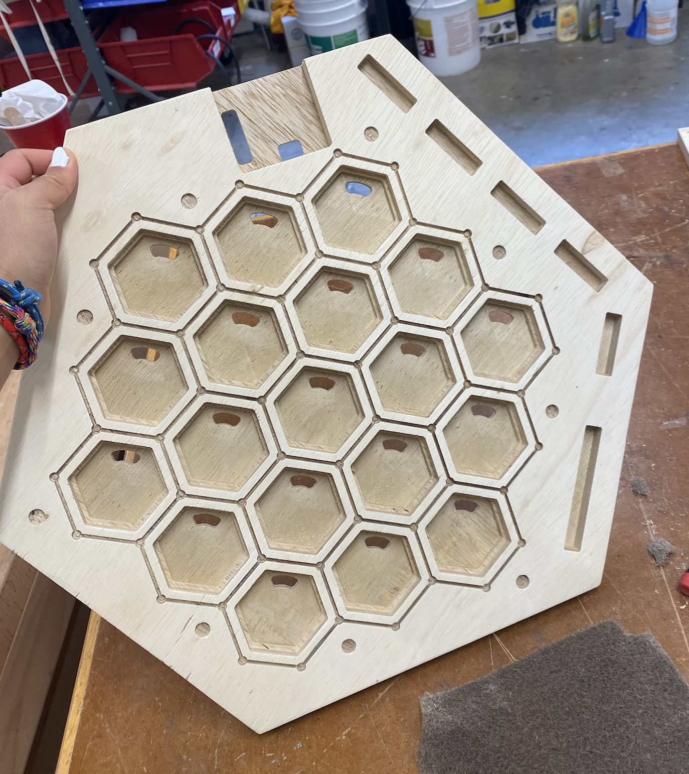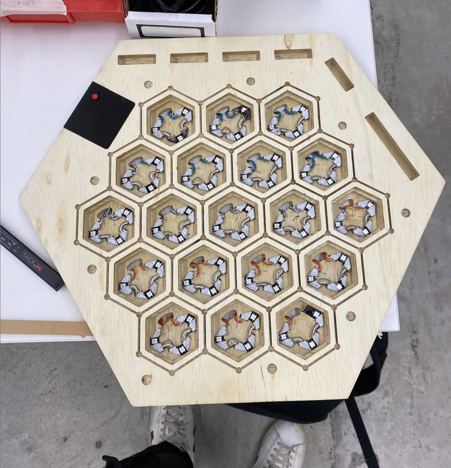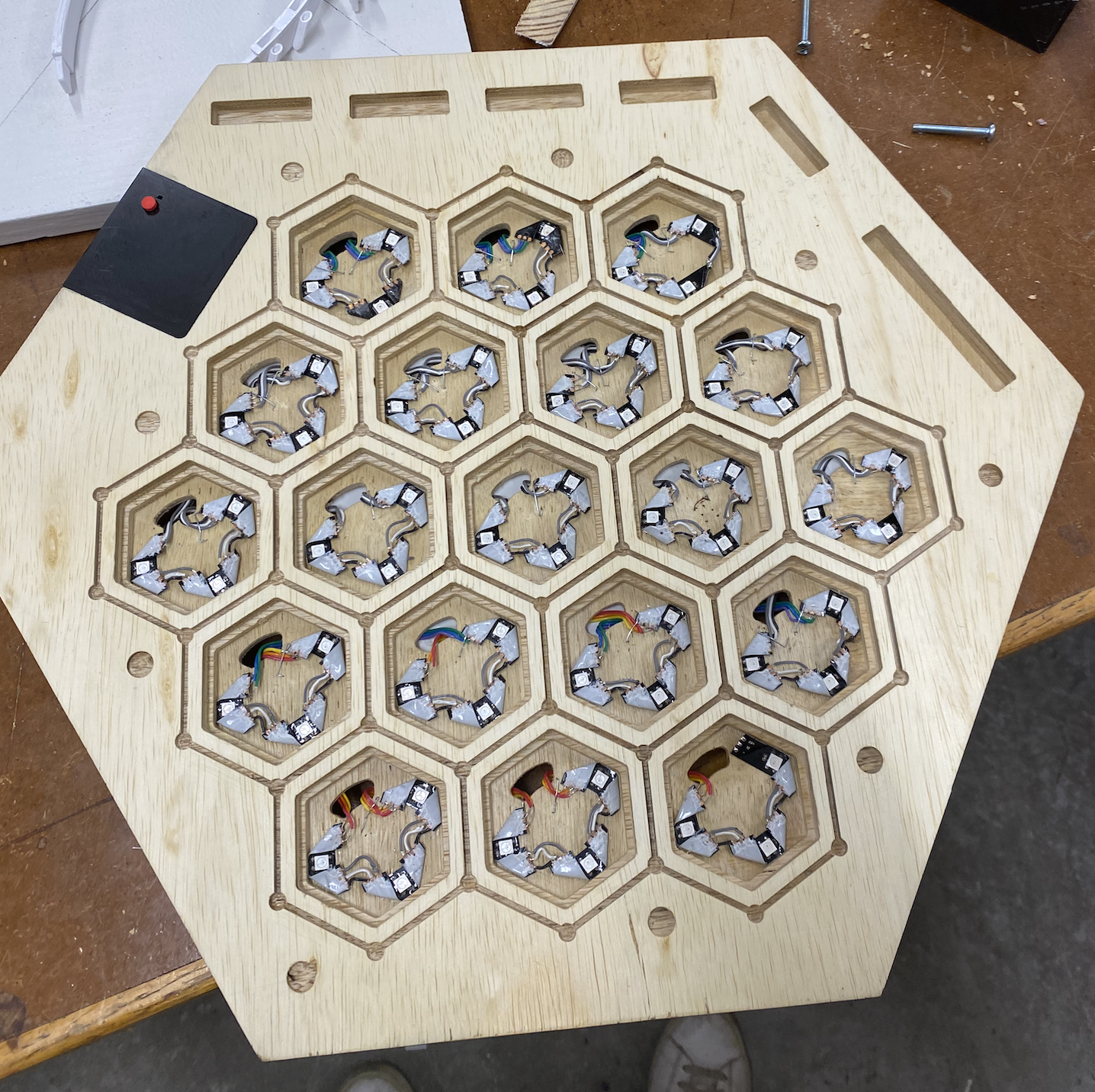 Now that I had my plywood milled out, I had to solder in all of the LEDs. This took so much time, since this meant cutting out each neopixel, soldering all 57 together across different hexagons and parts of the board. I used the shop's rainbow wire to do this, since I wanted the wire running between hexagons to be pretty secure and stuck together. I also made some soldering mistakes when I turned hexagonal lines, since I wired the D-in and D-out pins on the Neopixels incorrectly. After running some test code to light up all the Neopixels, I quickly found my problem and resoldered things on correctly. Here is the final wired board: