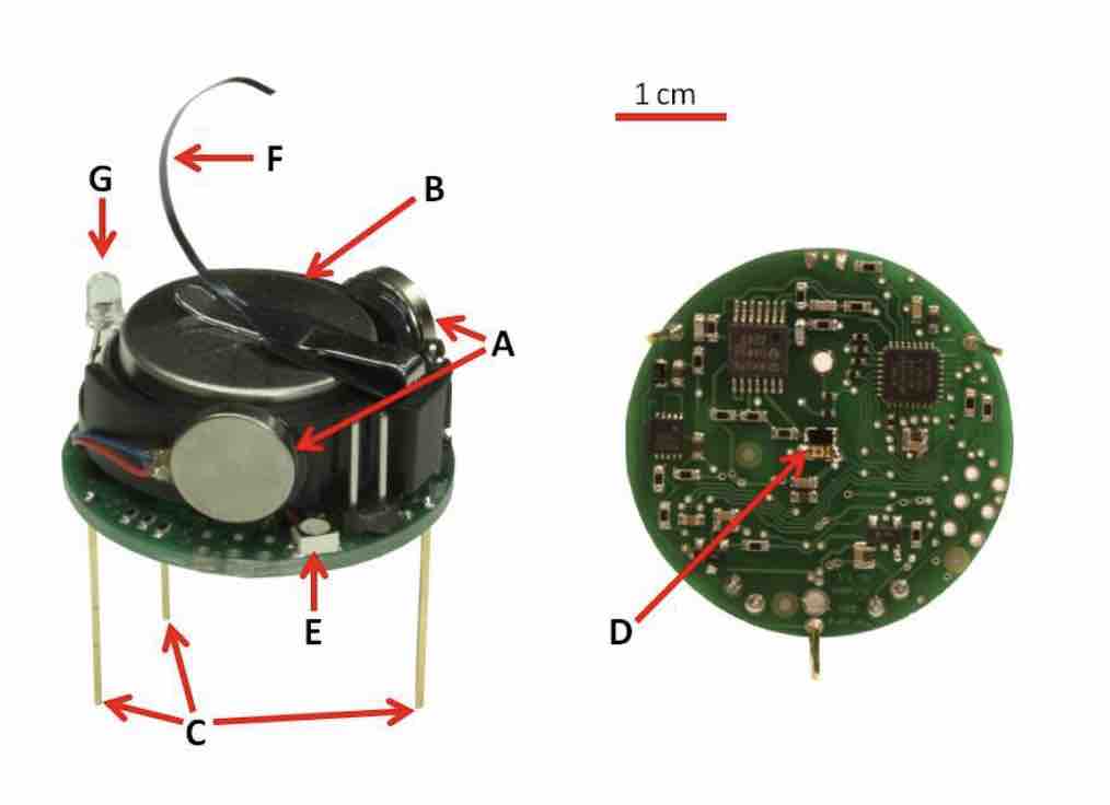The design of the Kilobot is: a rechargeable lithium-ion battery, a three color (red, green, and blue) LED which displays information to the user, and two vibrators for movement. When either is activated, the Kilobot turns at about 45° per second. When both are activated, the robot moves forward at about 1 cm/s. The robot stands on 3 rigid legs, which elevates the robot 2 cm above the surface. The individual robots are equipped with an infrared transmitter and receiver so that they can communicate with each other. The transmitter of a robot sends light toward the surface which reflects up to the receiver of another nearby robot, which then executes a command based on the program.