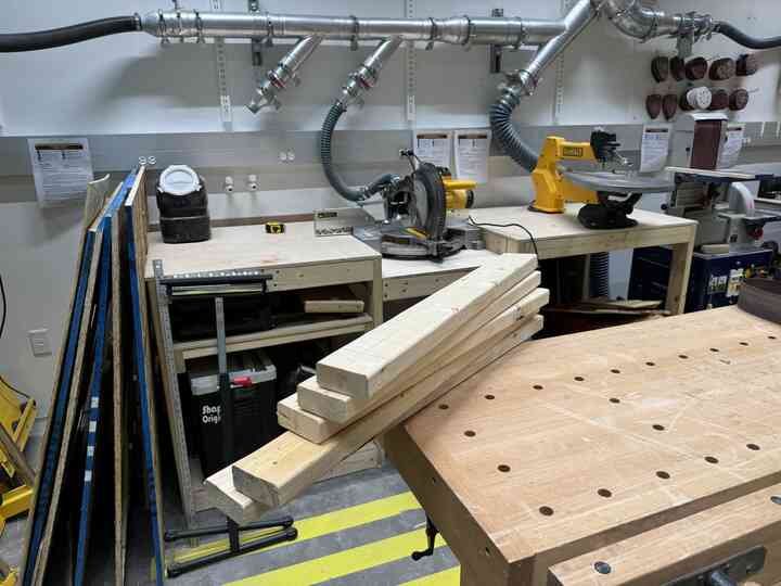 I brought some wood over from my job at the theatre. I cut down some white 1x4s into 30" long pieces, which was the smallest that would fit through the door of my dorm room.