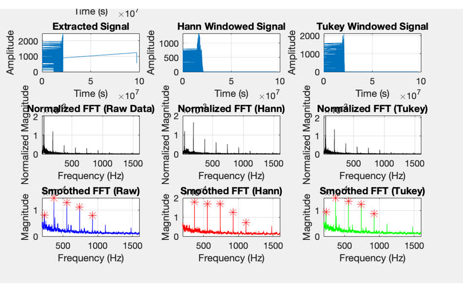 I performed windowing functions (turkey and hann) to prevent spectral leakage and reduce noise. This greatly improved the output, and solid peaks were identified.