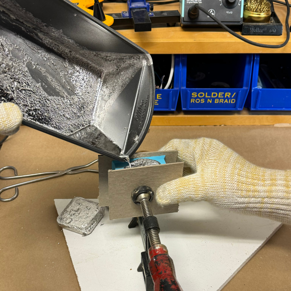 Molten tin alloy was heated to the appropriate temperature and carefully poured into the silicone mold cavity. Safety precautions, including gloves and protective gear, were adhered to during this process to manage the molten metal safely. The alloy cooled and solidified, taking the shape of the figurine.