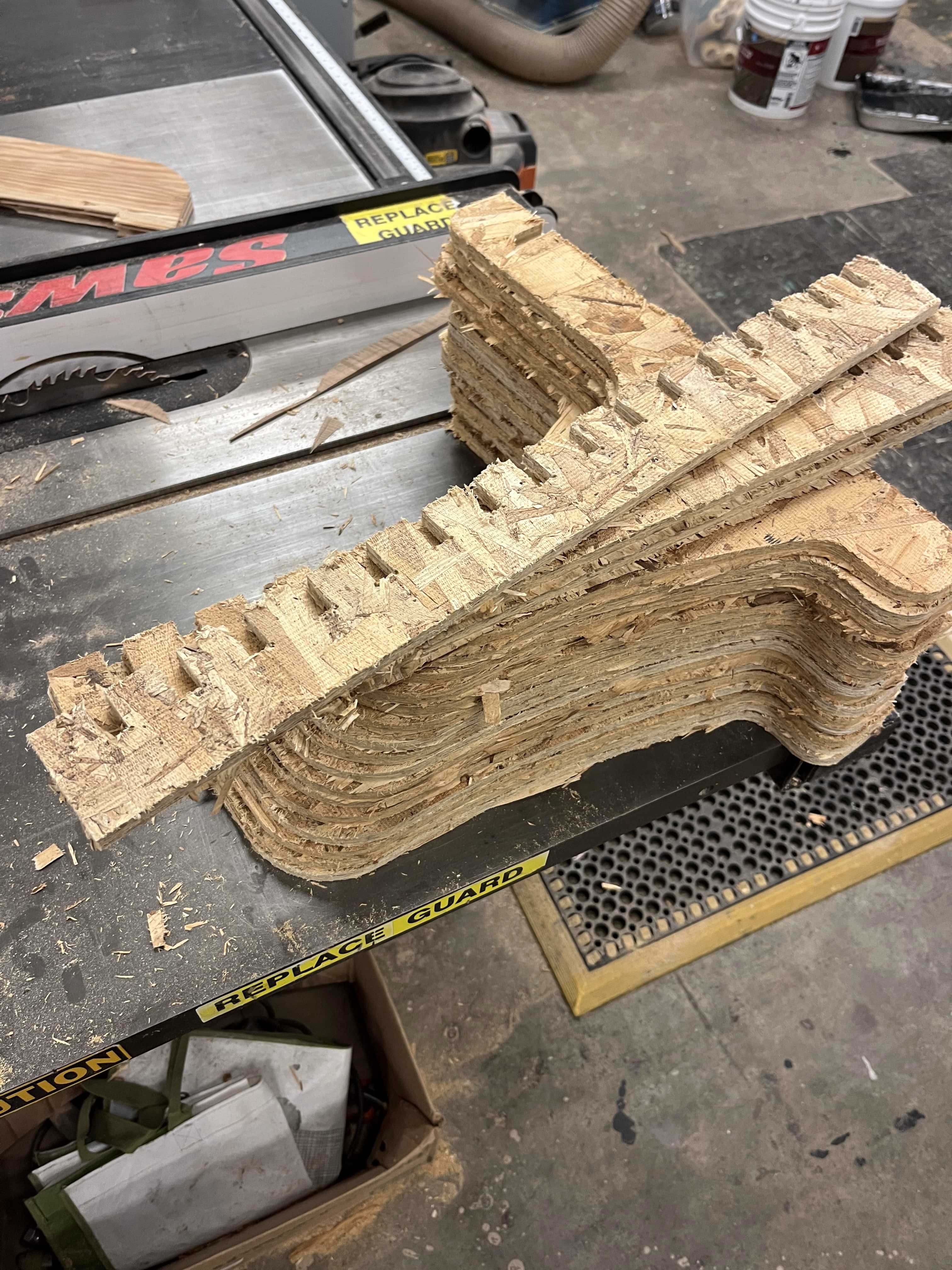 This took me longer than I expected; I wanted each “sheet” of the shelf to get progressively shorter to give a flowy feel, but I also needed the joints to stay aligned with each other so that I could easily assemble to rail. I also initially mis-measured and made the components too big to fit on my sheet of OSB, requiring me to backtrack a bit.
