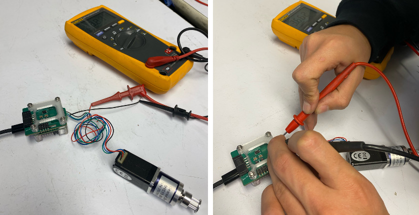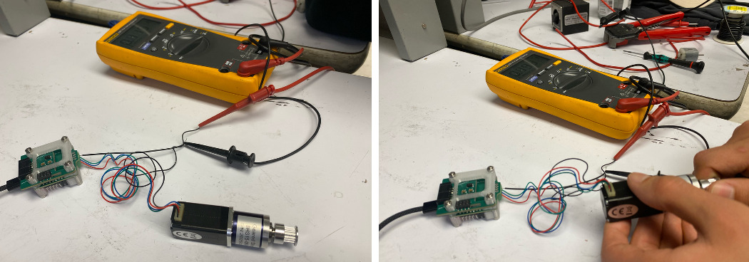 Sara and Dimitar met up to measure the power consumption of two output devices: a NEMA8 with a gearbox and a DC motor. For the NEMA8, we ran the motor at a speed of 10 rev/s with a constant current and used a multimeter to measure the current through each of the wires in turn. The first one was 115 mA. We tried holding the motor shaft to add resistance and see what happened. This increased the current to around 190 mA and caused the motor to stall. After unplugging and replugging the board, we testing the remaining wires in turn, which also came out to ~115 mA each. The image on the left is probing the black wire yielding ~115 mA, and the image on the right is while holding the motor shaft, yielding the ~190 mA reading.