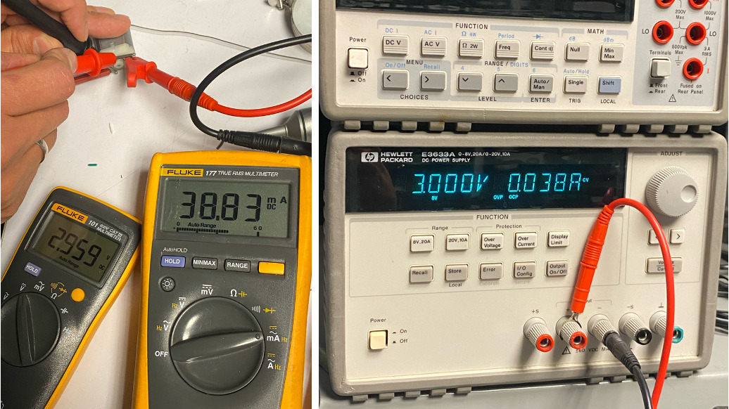 Following this, we used a power supply to power a DC motor at 3 V and 0.038 A. We measured the voltage to be 2.959 V and the current to be 38.83 mA, which matched this. We calculated power from P = I * V to be P = 38 mA * 3 V = 114 mW. Here are some images from those measurements.