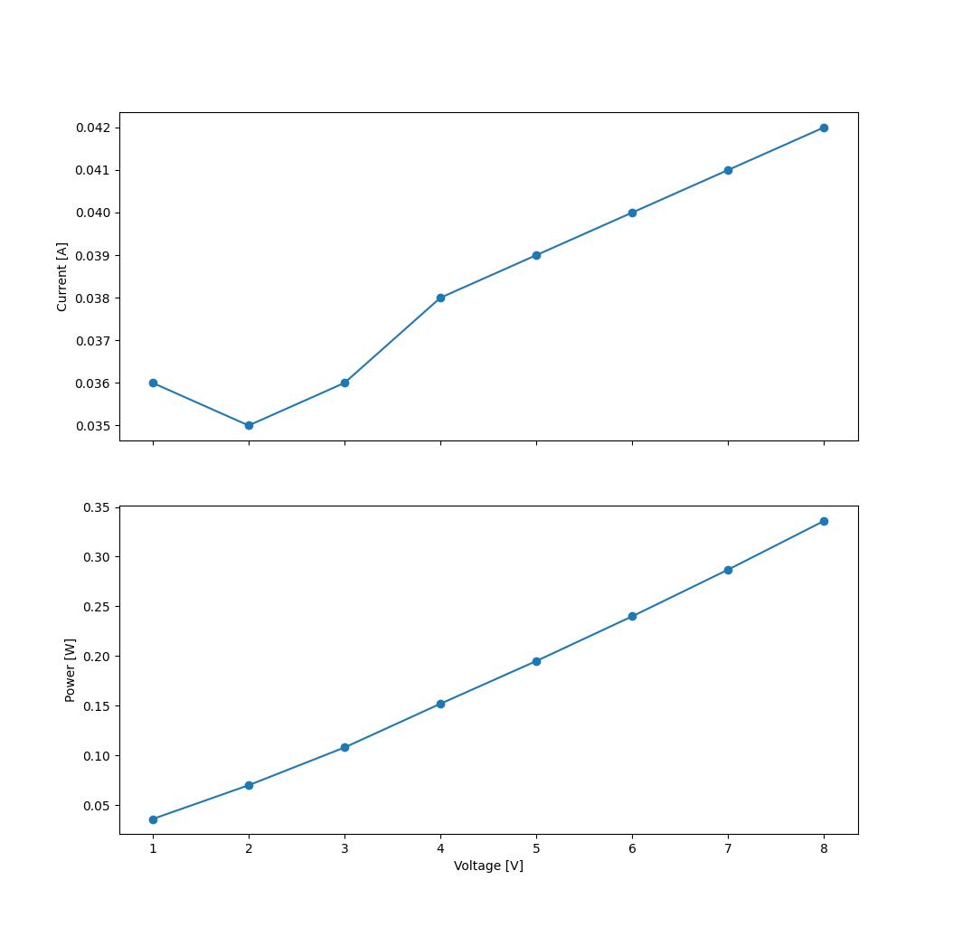 Having validated that the voltage and current readings at the power supply match the DMM readings at the motor, we used them to record the current at 8V, 7V, 6V, 5V, 4V, 3V (again), 2V and 1V (in that order), with the motor unloaded. The results are below: