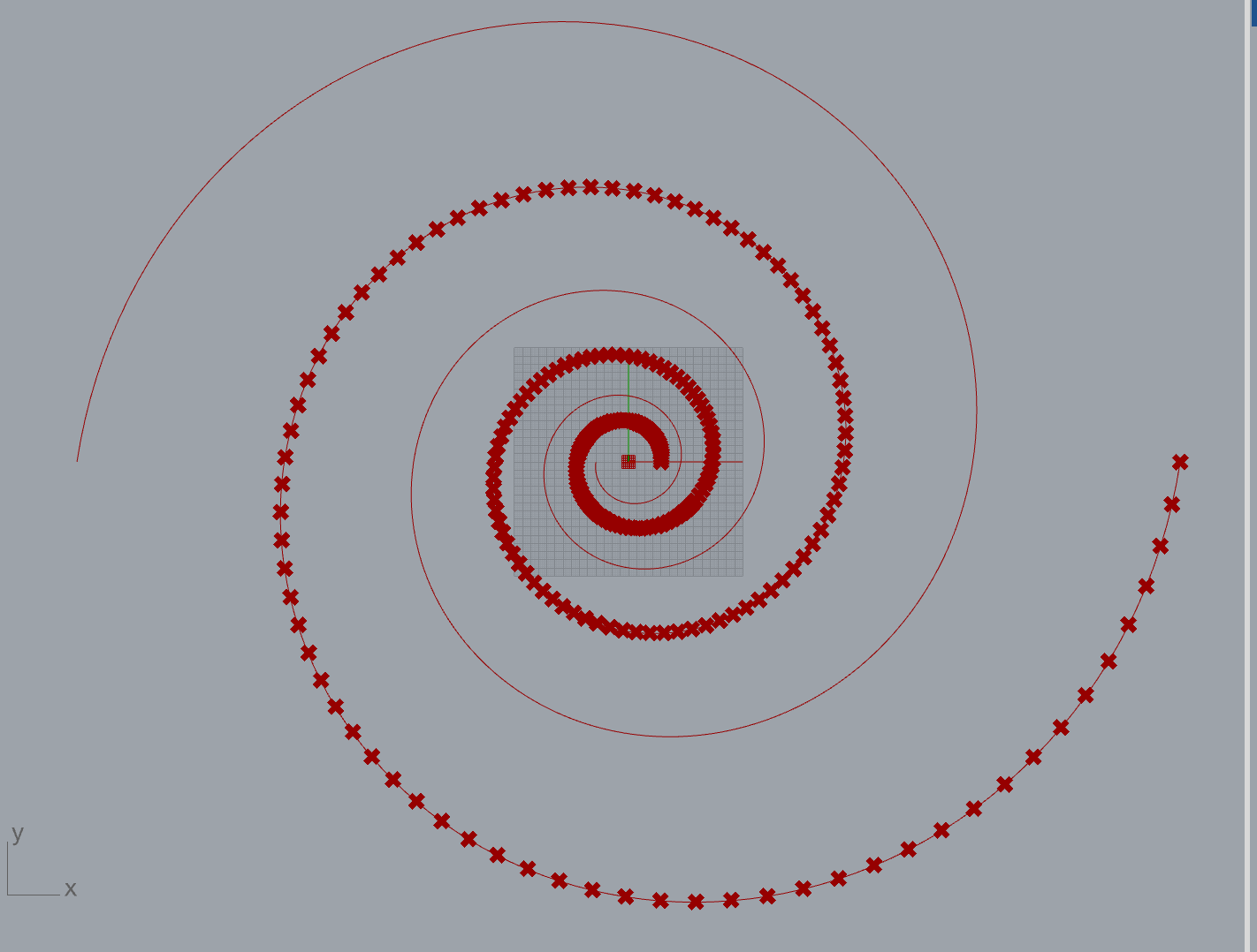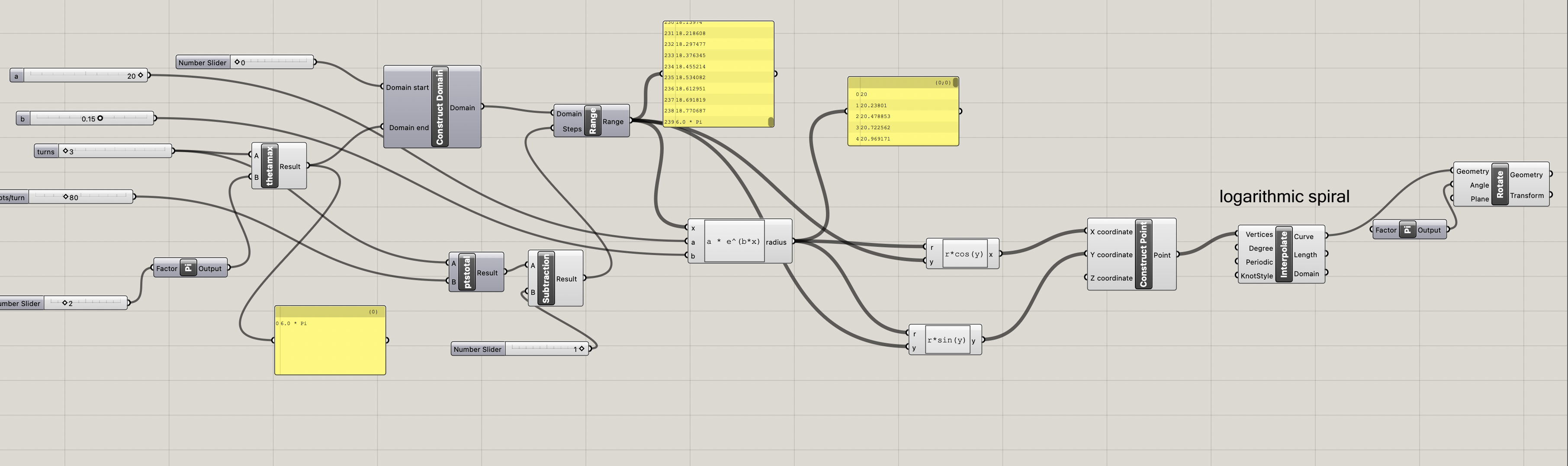 I used Grasshopper to help me generate a logarithmic spiral using an expression a*e^(b*x)