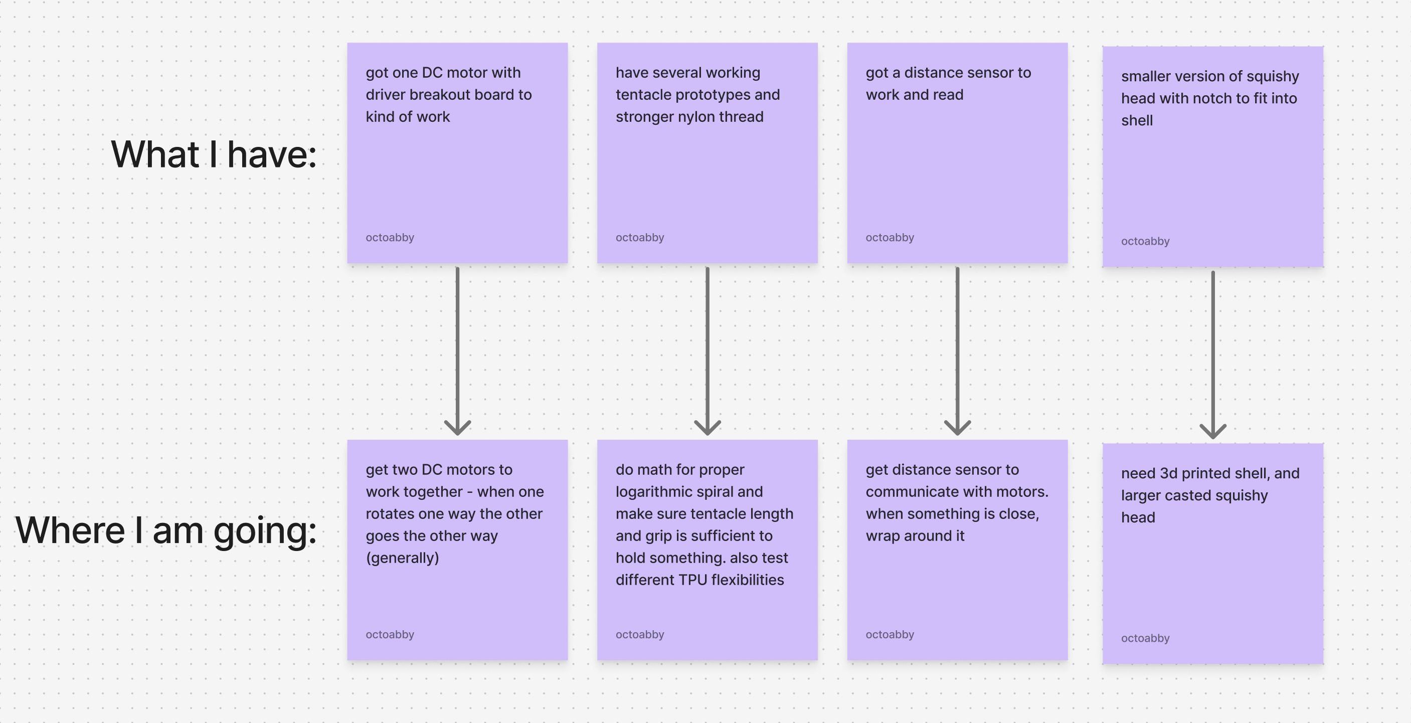 So plan from now - during output devices I want to have several functioining TPU tentacles to see if they work with the little DC motor I have, and get better cables.