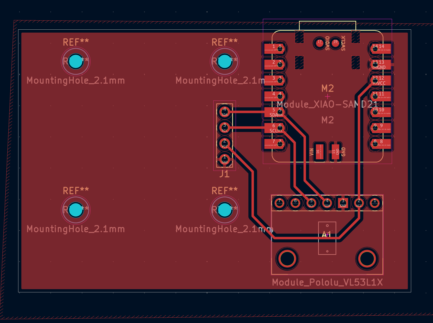 I did redesign it slightly (again) to have a OLED screen, since in my last iteration with the RP2040, my serial monitor would not connect since I was connecting via UF2. I am also using a XIAO SAMD21 and the Pololu VL53L5CX Time-of-Flight 8x8 Zone Distance Sensor Carrier.