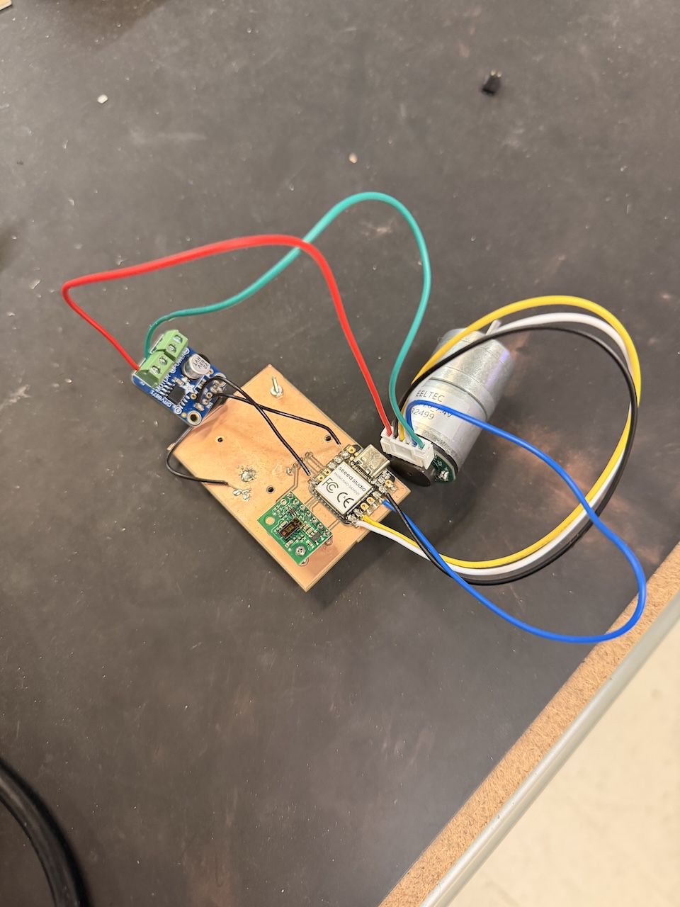 I began soldering everything together, starting with the motor's wires. The blue goes to the microcontroller's 3.3V, black to GND. and yellow and white to any digital pin so I went with D7 and D8.