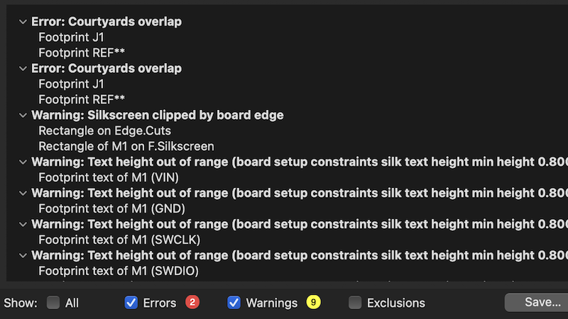 But I did not fret. The errors were from the mount holes slightly overlapping with the bounds of the connector, but I do not think it will make any difference on the actual PCB.