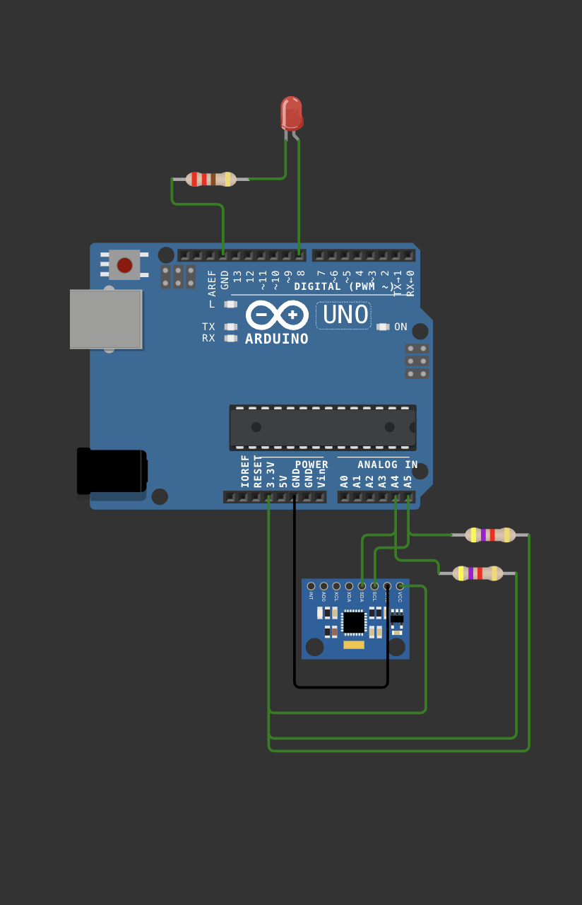 I asked ChatGPT to help me figure out how to simulate what I had in KiCAD in Wokwi. Basically, I am using an Arduino UNO board in place of my Xiao RP2040, a MPU6050 Accelerometer + Gyroscope instead of my VL53L1CXV0FY (since they are both I2C and have SDA/SCL), and kept my 2 resistors. I also added a little LED for fun and to show that the sensor is recognized.