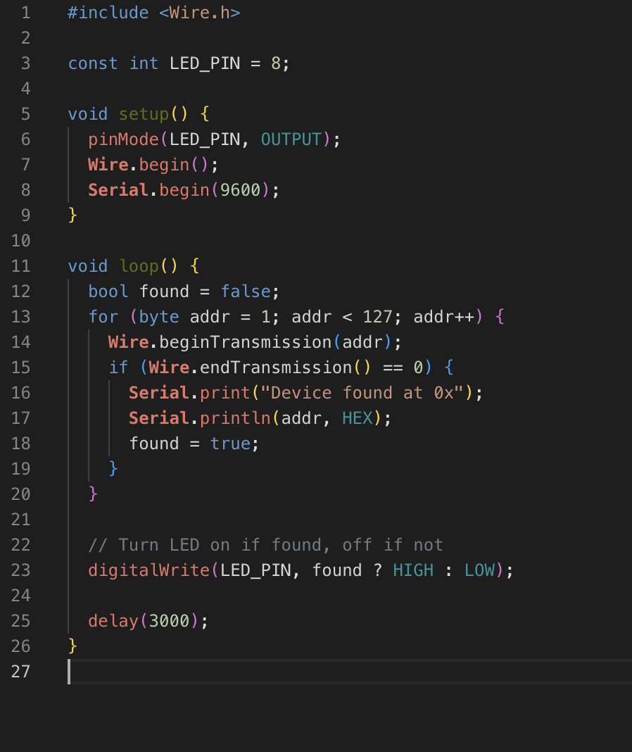 So the microcontroller searches for an I2C device, and if it finds one, it turns on the LED. Even though I am not simulating the funciton of the distance sensor, I was able to simulate that my wires and things generally work, and that the microcontroller would be able to read an I2C device. Here is