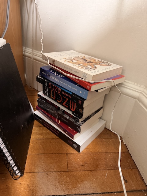 In dorm room at Wellesley, there is nowhere to put my precious books! They sit sadly in a pile in the corner... collecting dust... never to be seen again...