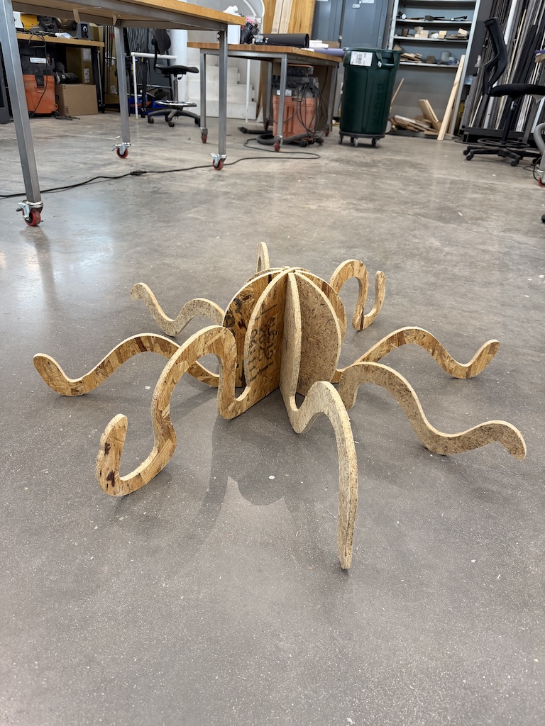 During lasercutting week, I obviously made an octopus. But it was somewhat of a feat, as I created my own 4-way cross joint. I wanted to take this and see if it would work scaled up, so I exported my octopus head file to Fusion.