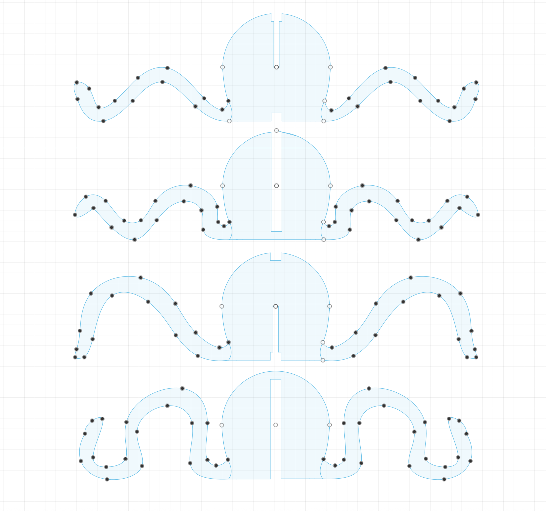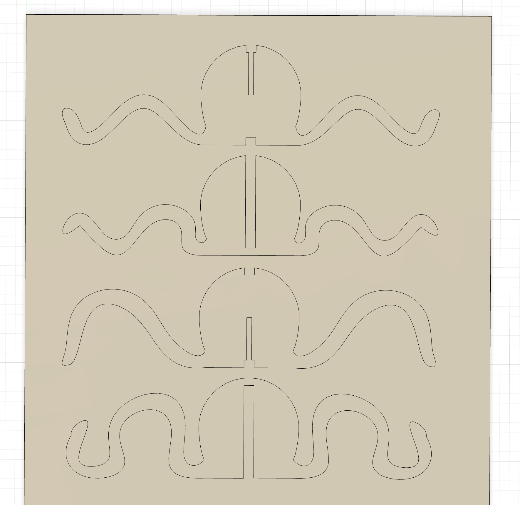 I then drew in different waving tentacles for some variety. The head part works by intersecting the two smaller slots perpendicularly, and then the larger slotted ones intersect those.
