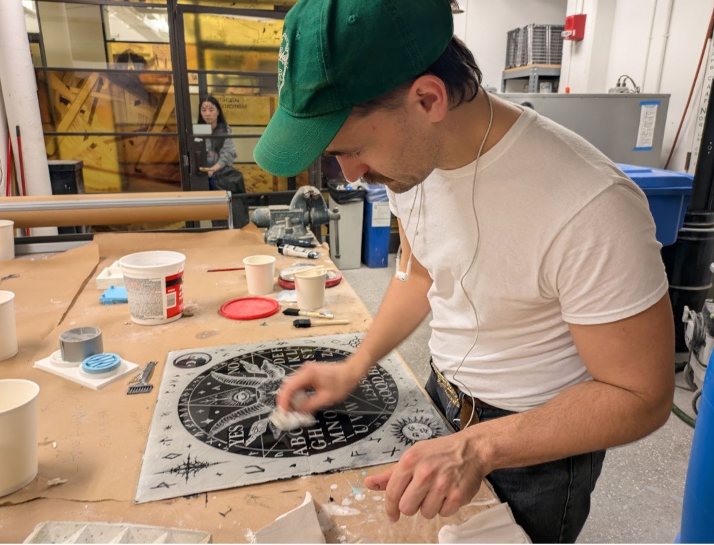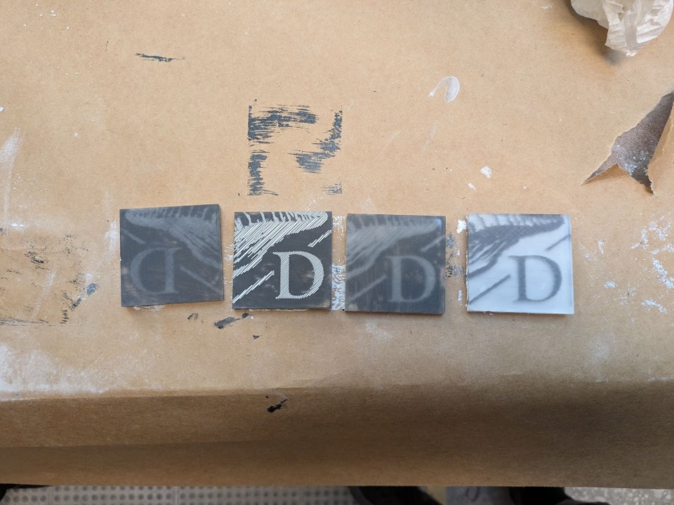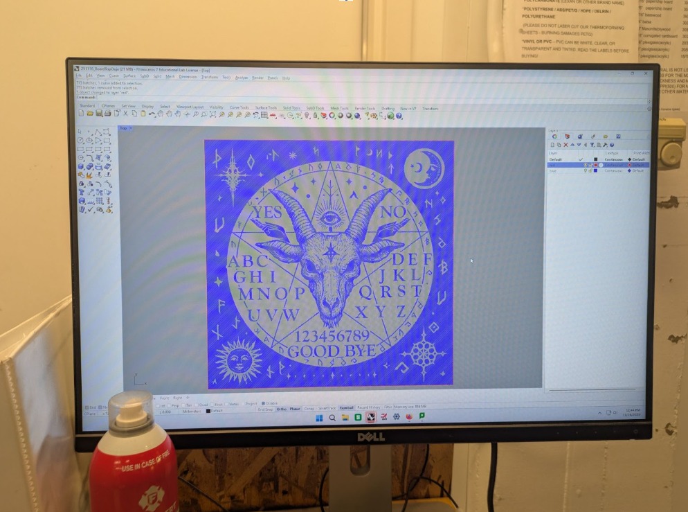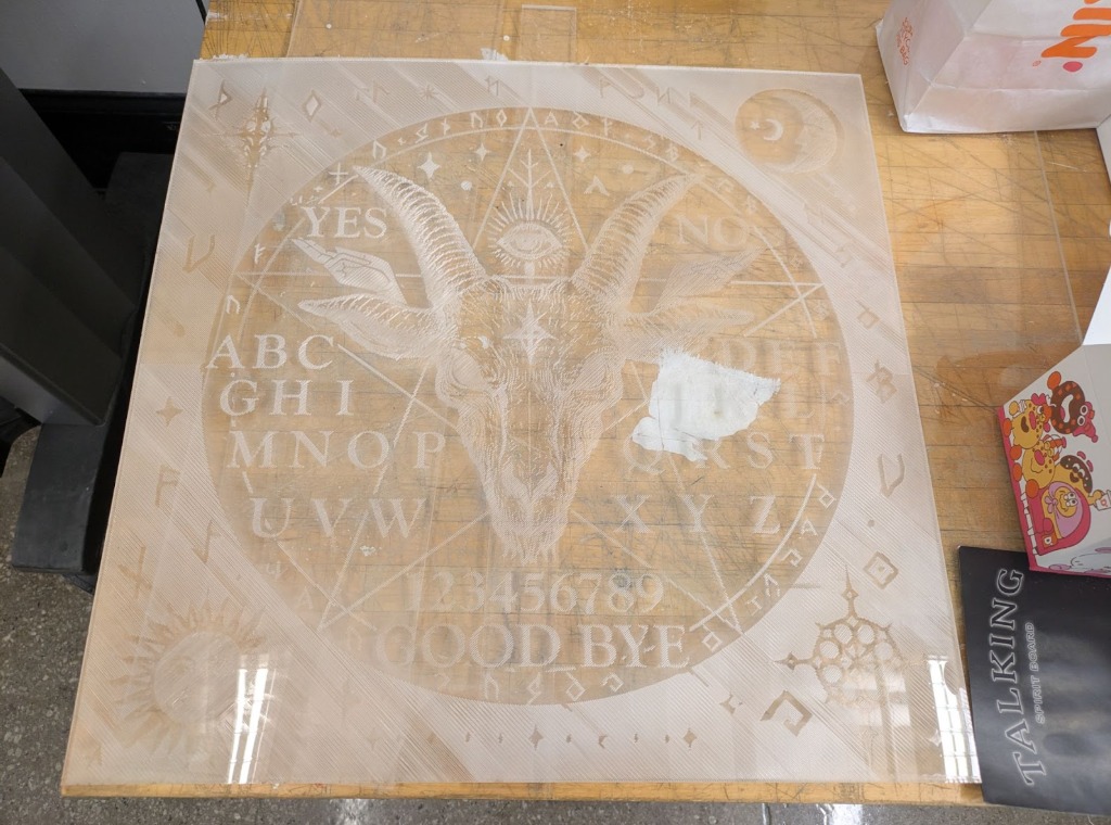 The board needed a slick top surface so the planchette would glide with minimal friction. That meant etching from the back, not the front. By divine intervention, Chris gifted us a sheet of 1/4" plexiglass (thanks, Chris).