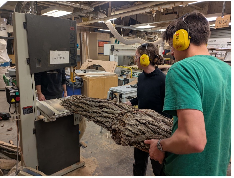 A tree recently died behind N52 and has been quietly furnishing the shop with free lumber. We continued the tradition: rough band-saw cuts, planed boards to consistent thickness, then cut/assembled/sanded the table for gantry integration.