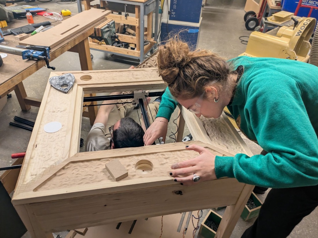 For Machine Week, our architecture group wanted something that felt playful and theatrical, but still demanded real machine integration: motion control, hidden mechanisms, tolerances, and a clean user experience. After some chaotic ideation (robotic tufter, cocktail mixer, etc.), we landed on the Ouija board: a “haunted” spirit board that appears to answer questions on its own… while hiding the entire mechanism inside a custom-built table. Its legacy was rooted in the mechanical turks of the 18th century.
