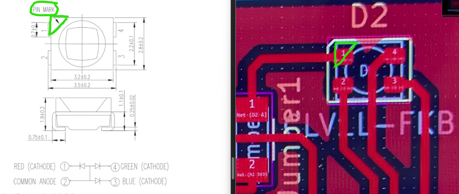 Still nothing was lighting up. I decided to double check over the CLV1A-FKB: PLCC4 3 in 1 SMD LED Data sheet to make sure that the Anode and Cathode plugs were correct. The footprint from the fab library is completely misleading. You can clearly see the anode in a different spot. It's not just an issue of notation on the LED component but is an issue with its footprint and geometry as well. I had to rotate the entire component and override the footprint in kicad in order to make an entirely new board as the LED has a rectangular ratio and not a square pin layout. I double checked with Griffin's github website where he had the correct orientation. I'm not sure why my library component from Fab was so incorrect, but it did cost me some time and my sanity.