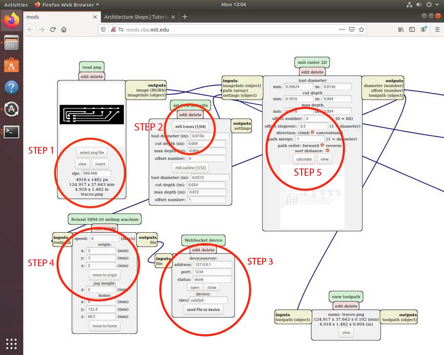 OK so group project happened, I was excited to start milling my own board! Earlier in the week I went to two walkthroughs of the Modela SRM-20. But when I show up, 1 of the 2 PCB mills is already down. That's ok, I'll just wait in the queue. No biggie. I left myself plenty of time to design, build, program and debug this week. Immediately I see people experiencing errors with the Modela SRM-20. I would say 9/10 problems are with the interface between the PC and machine. There are two commands to punch into terminal in the JS folder. No indication of which one is the correct one on the Architecture Shops Website. Trial by fire, sure. There was a diagram that was kind of helpful.