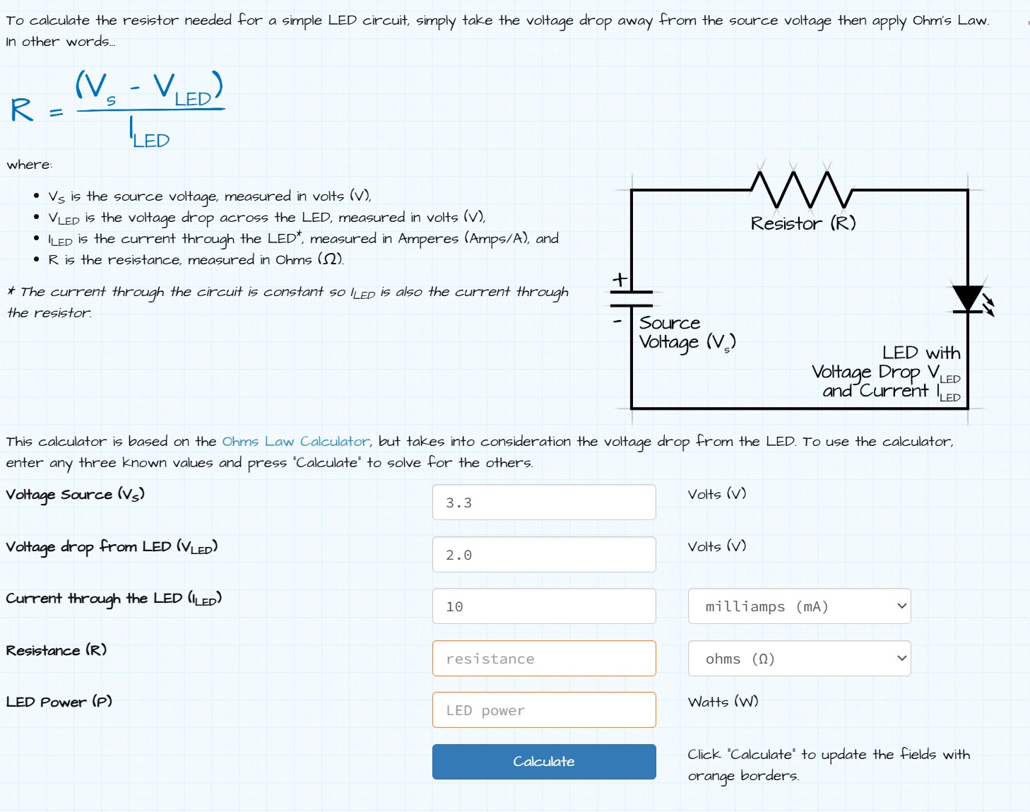 Using the Ohm’s Law LED resistor calculator, I applied the formula:
