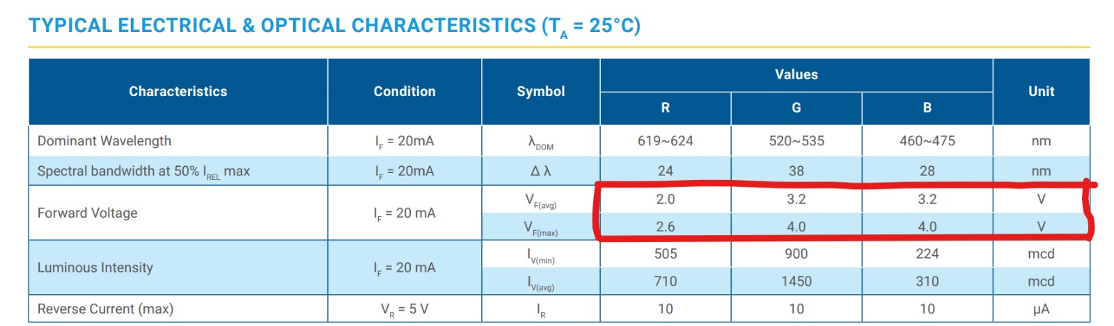 To safely use the CLV1A-FKB RGB LED with the Seeed XIAO RP2040, I needed to calculate the correct series resistor for each color. The LED datasheet specifies the forward voltage for each diode (Red: 2.0 V typical, Green: 3.2 V typical, Blue: 3.2 V typical) and a forward current of 20 mA.