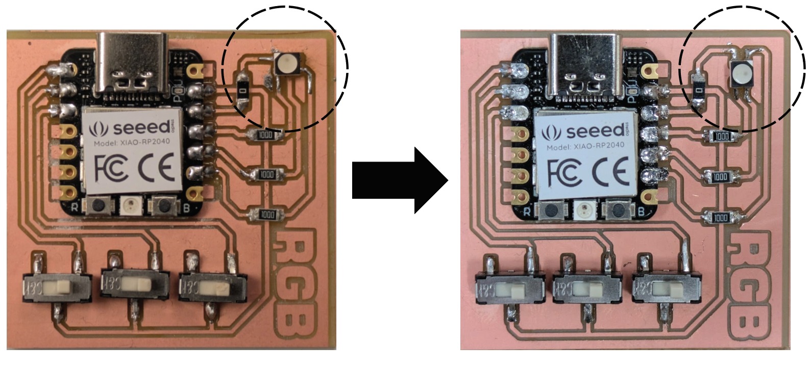 I tried to fix the problem initially through some janky solution to see if I could get a LED light working correctly. Ultimately I decided it was somehow quicker to just redo everything from exporting gerber files to milling to stuffing.