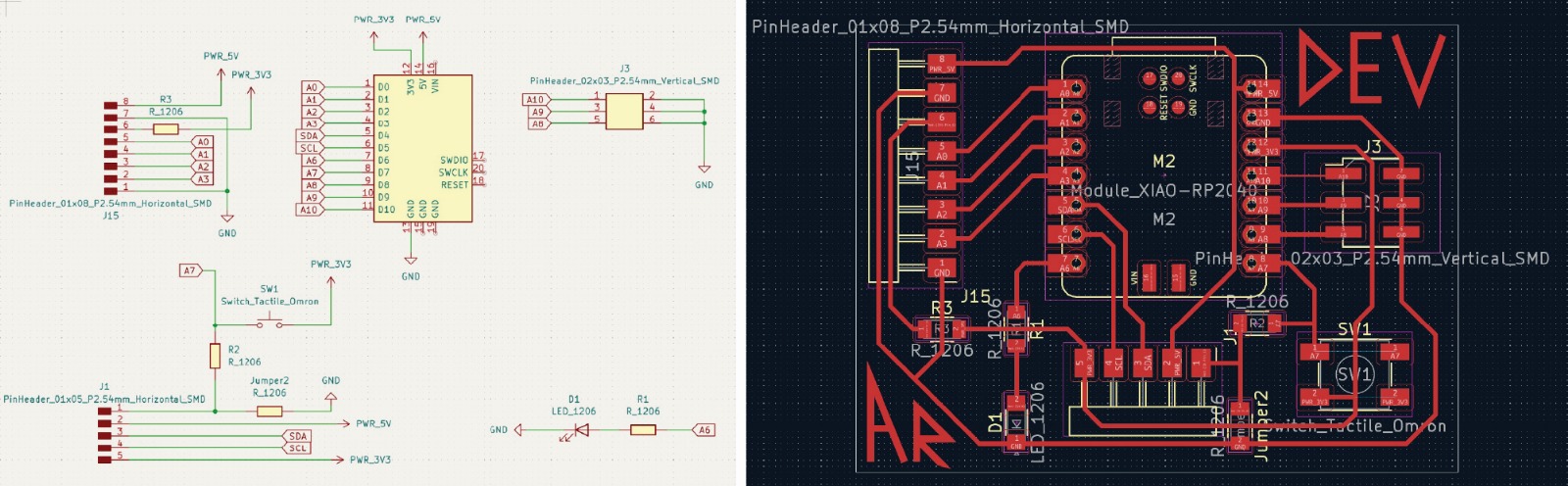 I designed a small breakout / development board to make connecting sensors simpler. Rather than soldering each input circuit individually, this board acts as a flexible testbed. It was inspired by Adrián Torres’ Fab-XIAO board, which provides a clean structure for experimenting with multiple inputs.