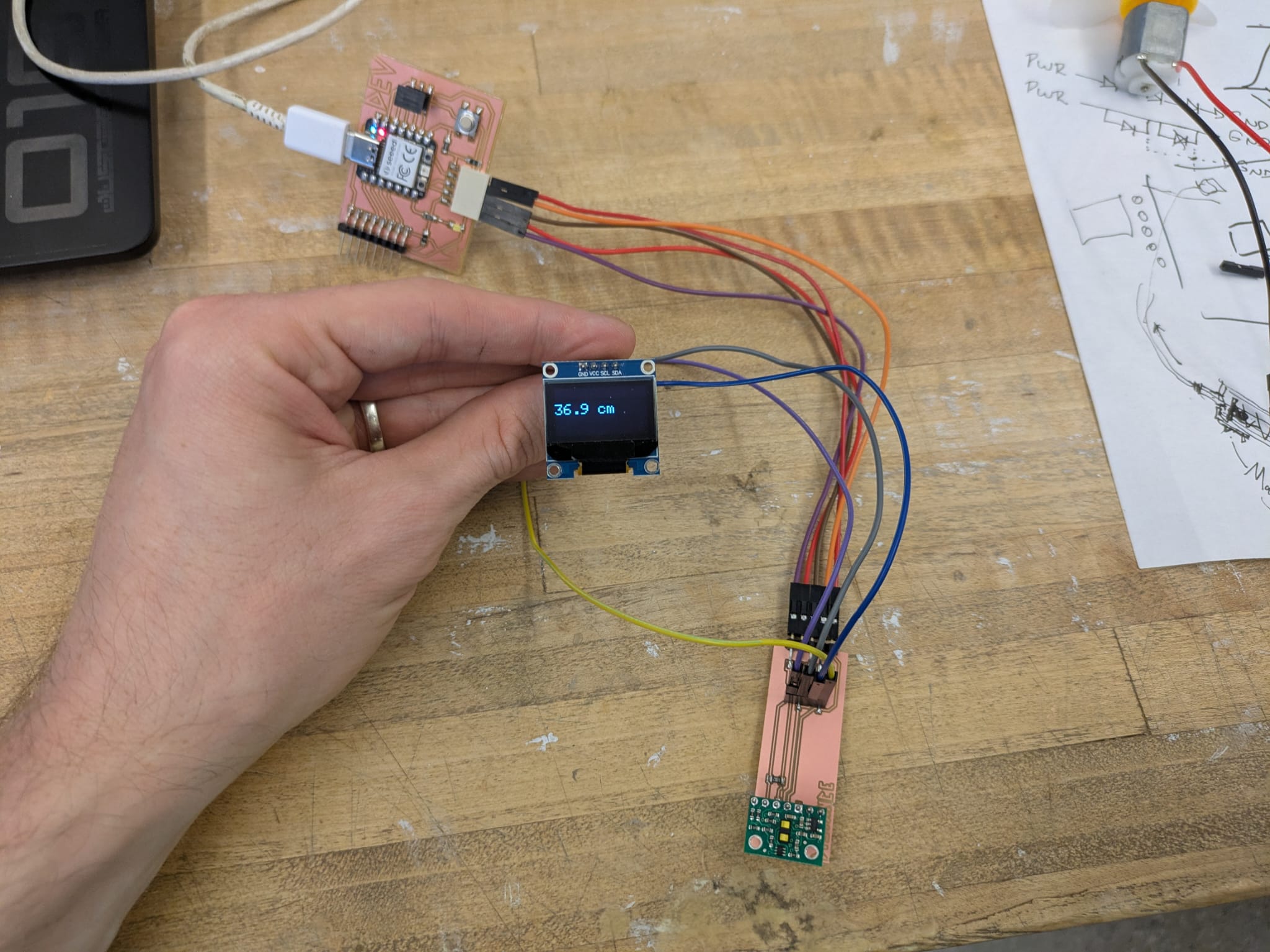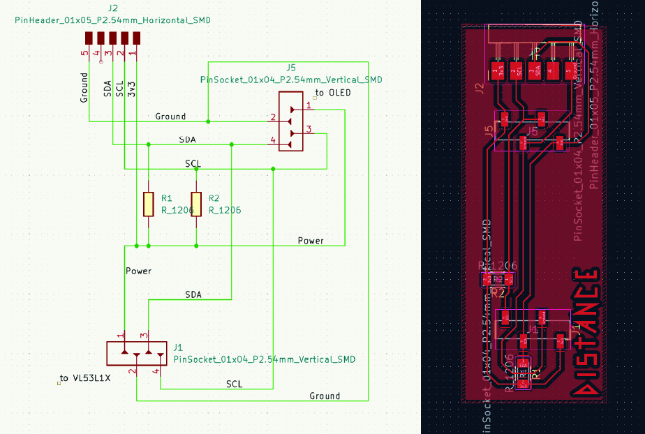 Finally I made a dedicated board combining the VL53L1X, a small I²C OLED, and indicator LEDs. The OLED displays live distance data without needing serial output. It’s mounted slightly behind the sensor plane (about 5–8 mm) to avoid blocking the ToF field of view. I reserved around a 32×32 mm footprint for the display on the PCB. Everything runs on 3.3 V through the same I²C bus. The resulting board acts as a compact diagnostic module — the sensor reads distance, the OLED shows it, and the LED visually echoes proximity in real time. Big shoutout to TA Gert on sharing his code with me, which allowed me to finish on time!