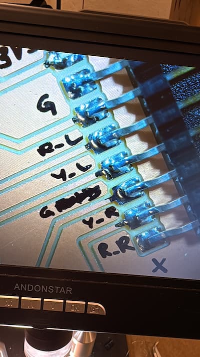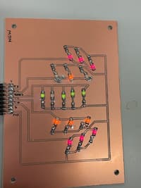 Unfortunately I made one big mistake, which is that I soldered all LEDs in the incorrect orientation/wrong polarity. I discuss this more in Week 9: Output Devices. Some learnings: lead-free solder is worse than lead-with(?); don't solder at 1am when you're frustrated from failures; and it's not the end of the world if you get a bit of solder on your board - just as long as it's not bridging anything.