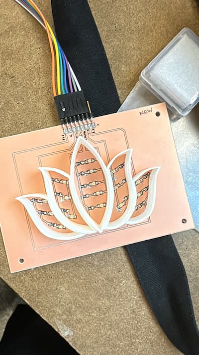 The biggest aeshetic elements were printing a really thin lotus to enclose the LEDs, putting it on a laser cut sheet of acrylic to diffuse the light. And then I also vinyl cut a sticker of a peacock to put on top of the box with Shah's help.