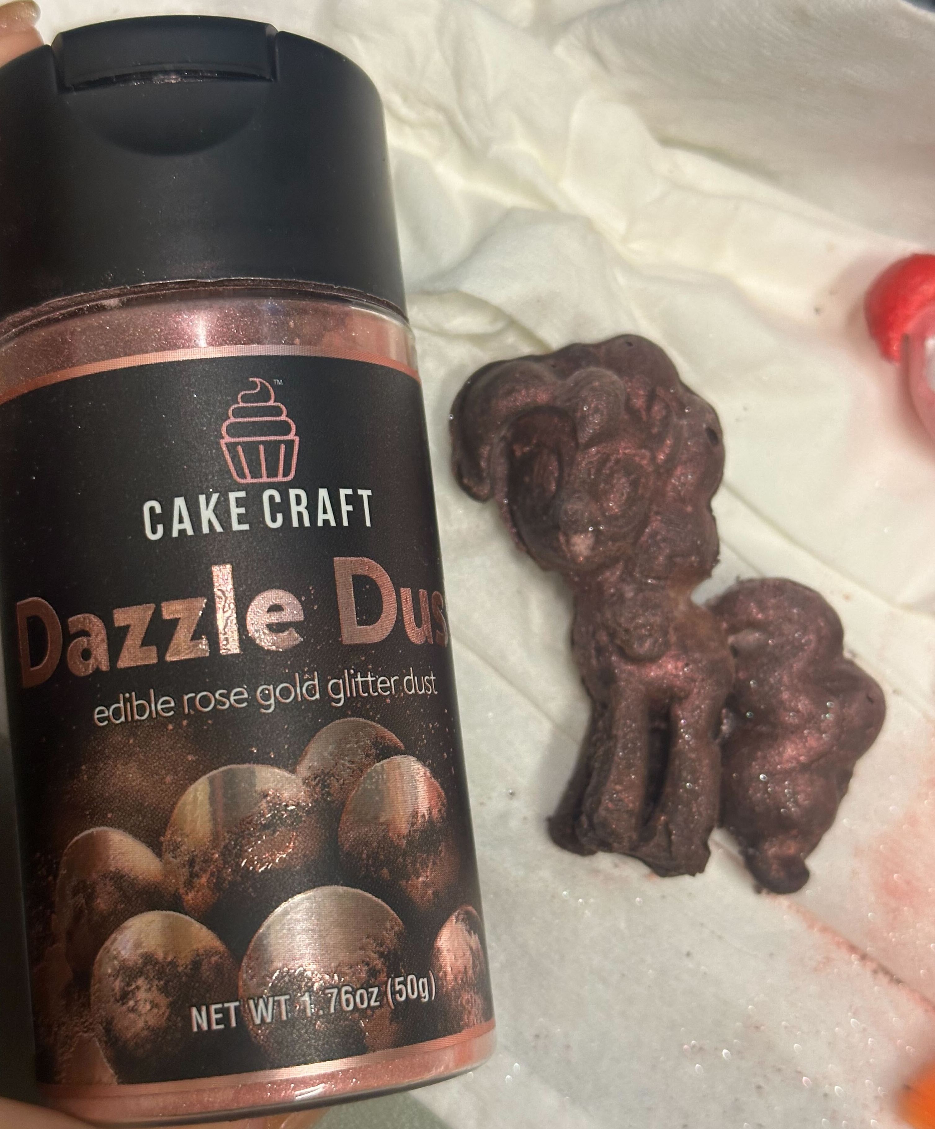 - I used a type of edible rose gold glitter before casting the chocolate.