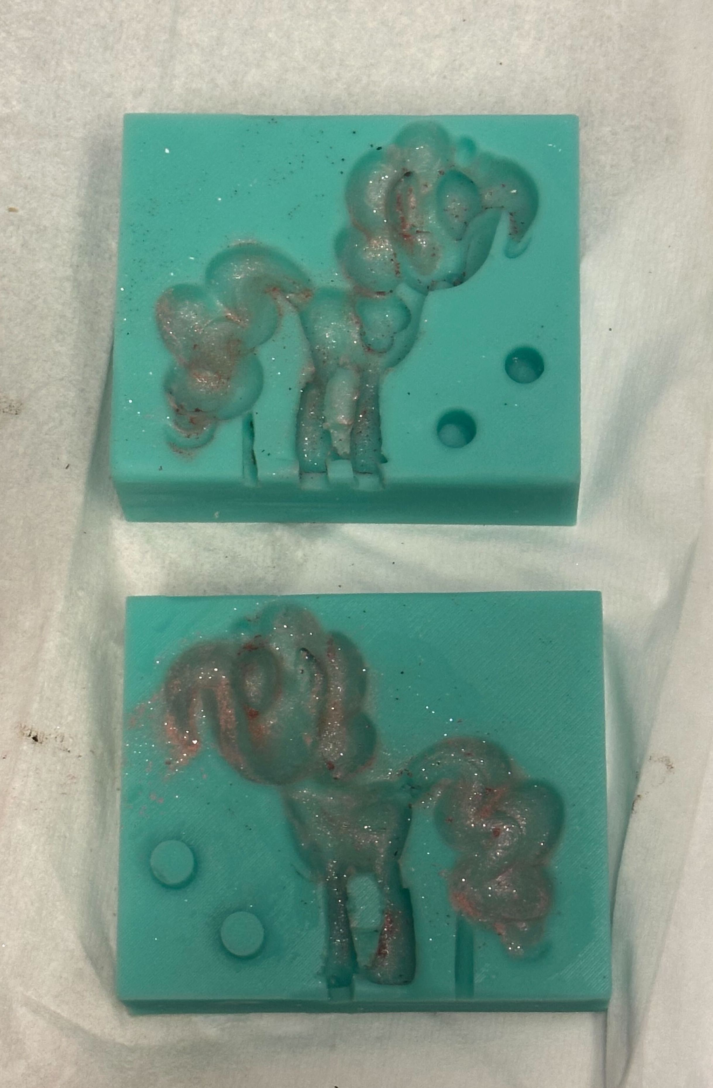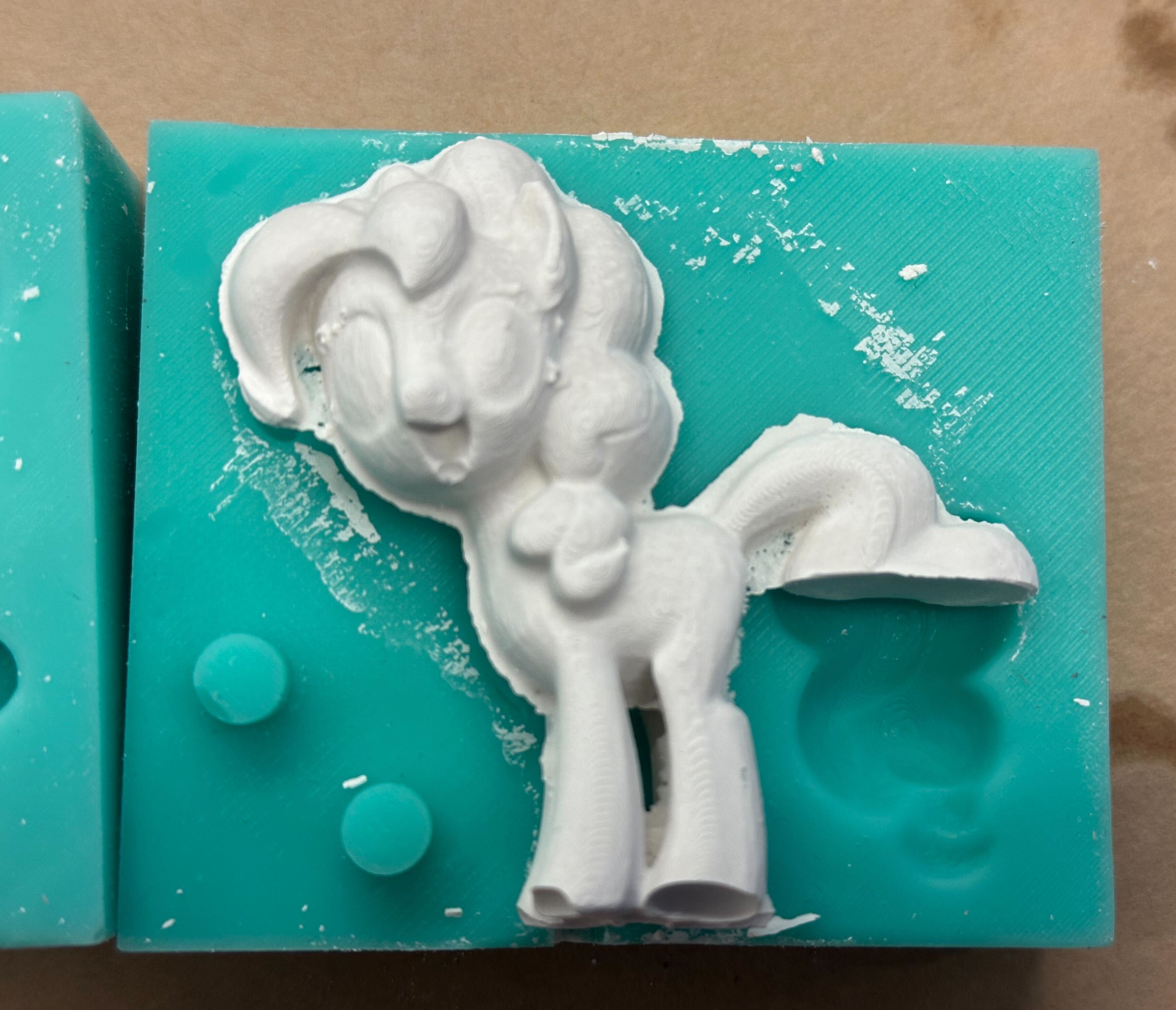 - After letting the drystone set and harden ~ 50 mins, I carefully demolded the drystone pony from the silicone mold. The final result is shown on the right. However, the pony tail didn't come out. So later I tried to open another casting path from the end of pony tail.