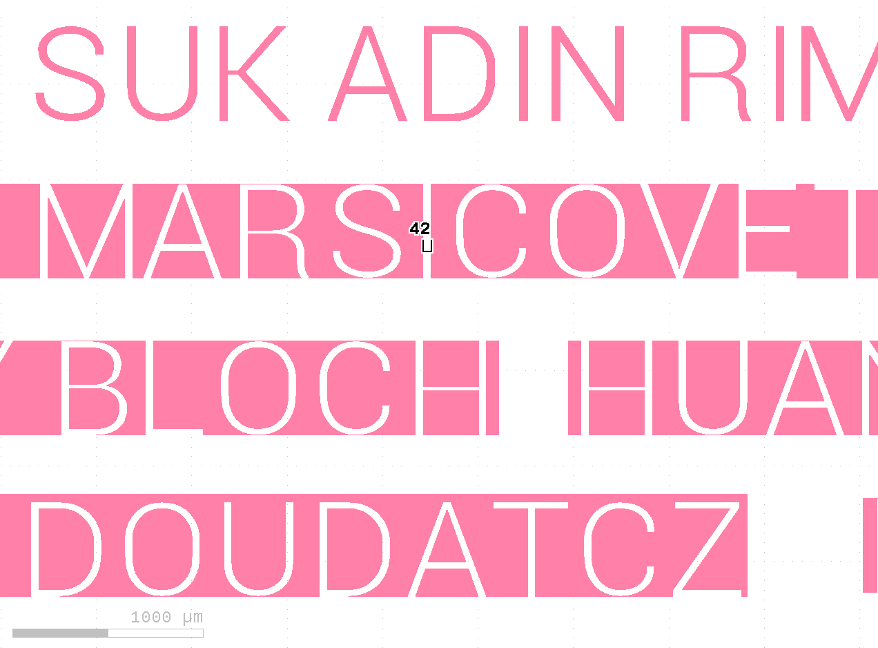 So, for the best visualization of a big chuck of words, I just keep everything uppercase. And with fine-tuning of the text font, text size and pixel width conversion(in micrometer), the layout can be made quickly and beautifully with each pixel converted to 42um in layout.
