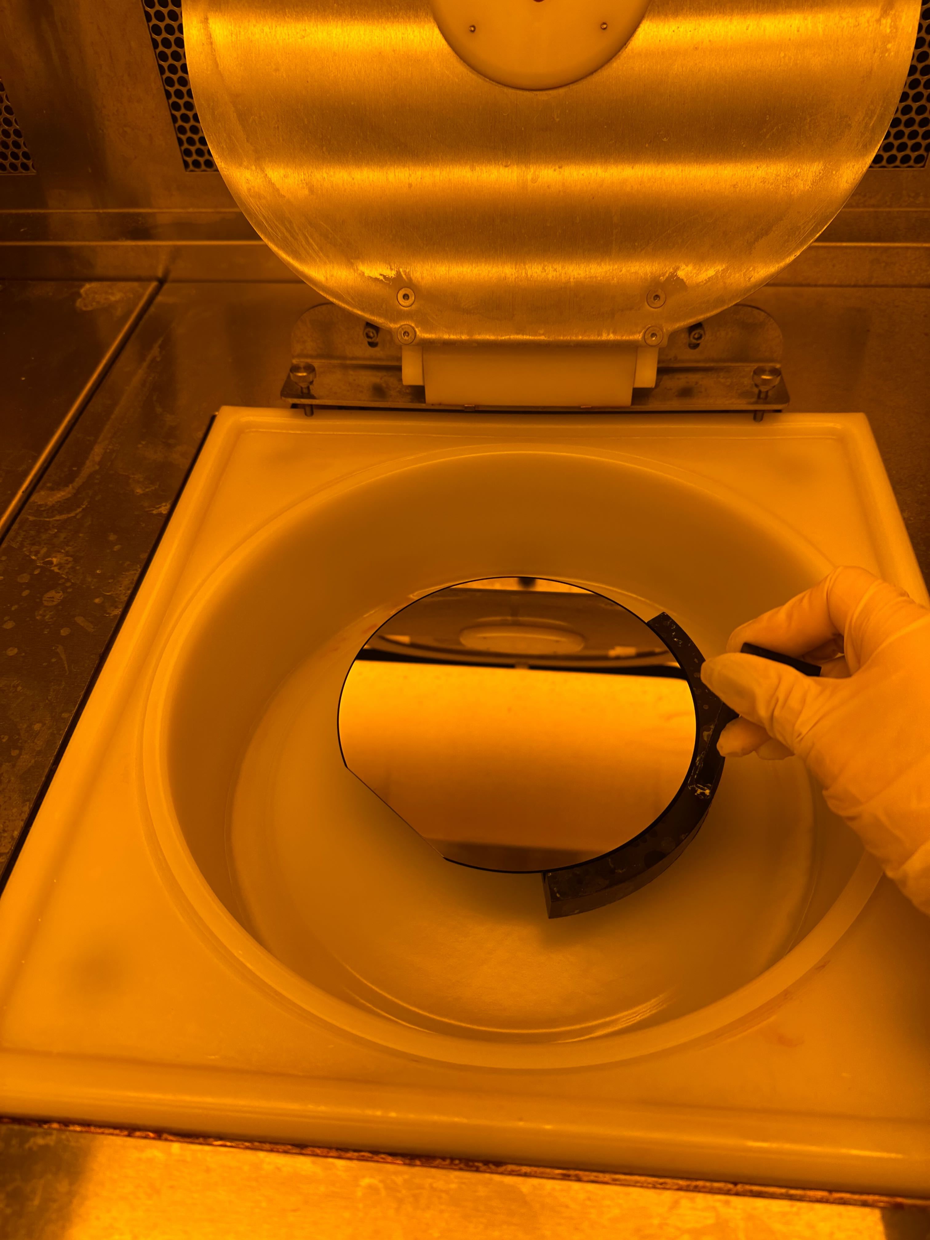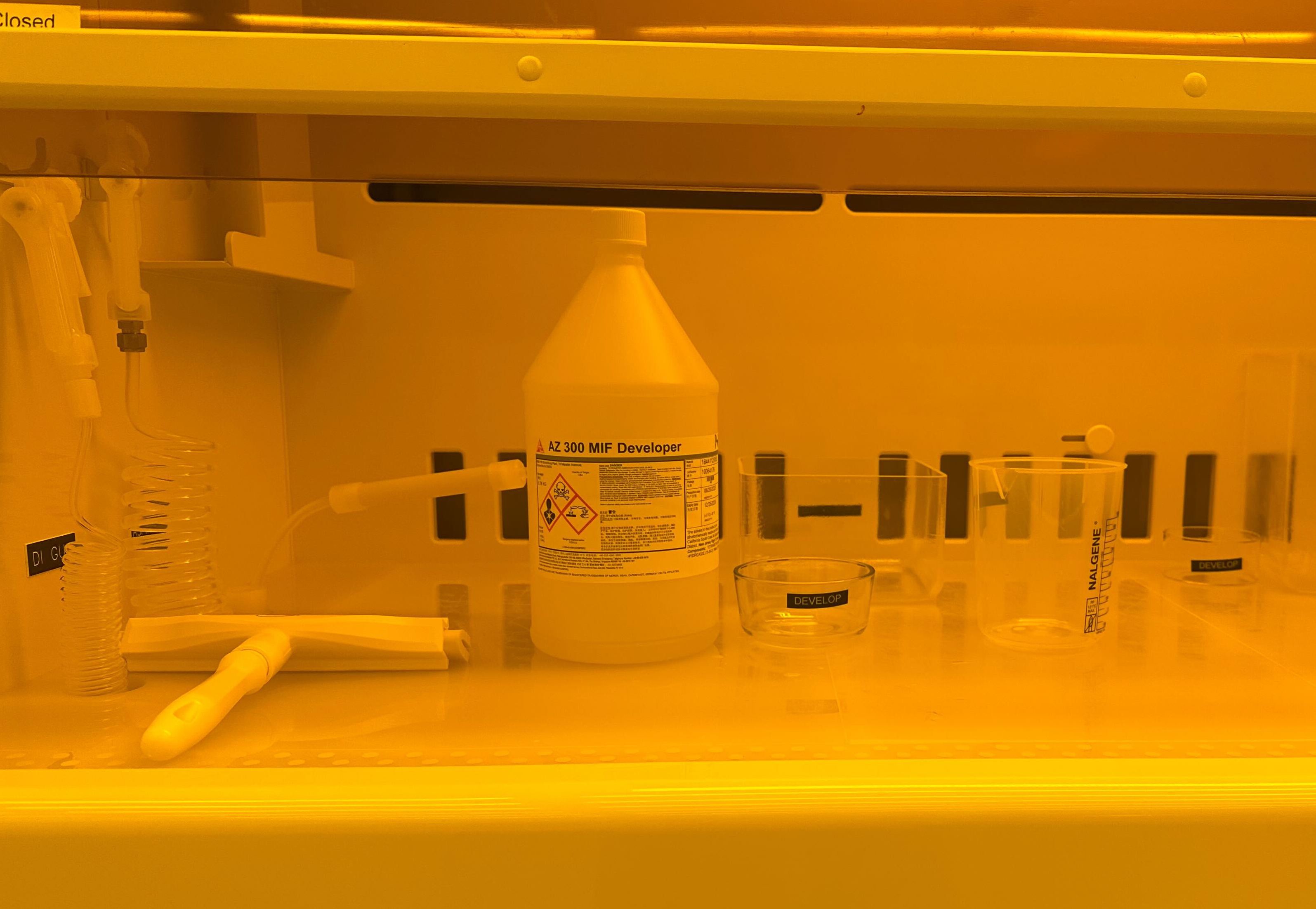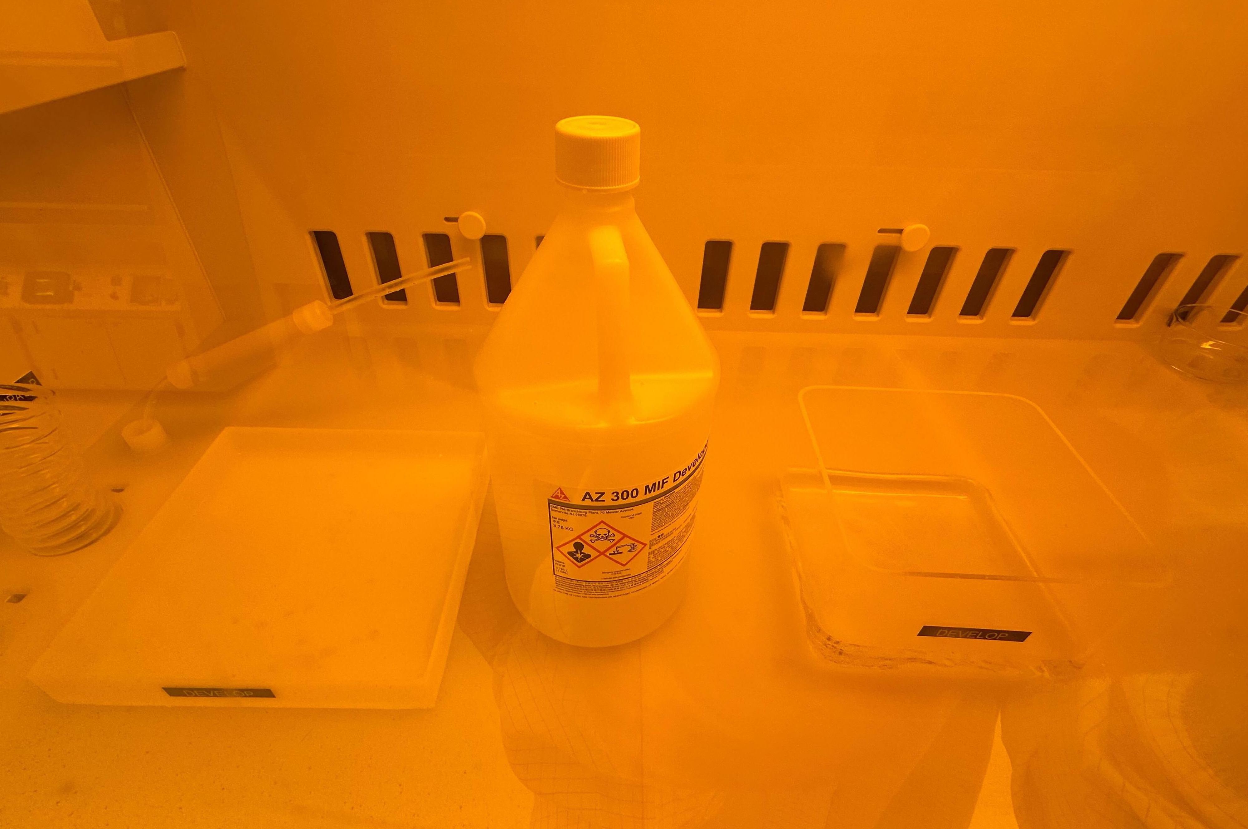 This time I did't do post-exposure baking and directly started developing in AZ300 MIF developer. Notice: ⚠️TMAH (tetramethylammonium hydroxide), the active component in AZ 300 MIF developer, is a highly alkaline and acutely toxic chemical that can be absorbed through the skin. Due to these safety concerns, the developer must be handled with appropriate wet-bench precautions and nitrile gloves to minimize the risk of exposure.