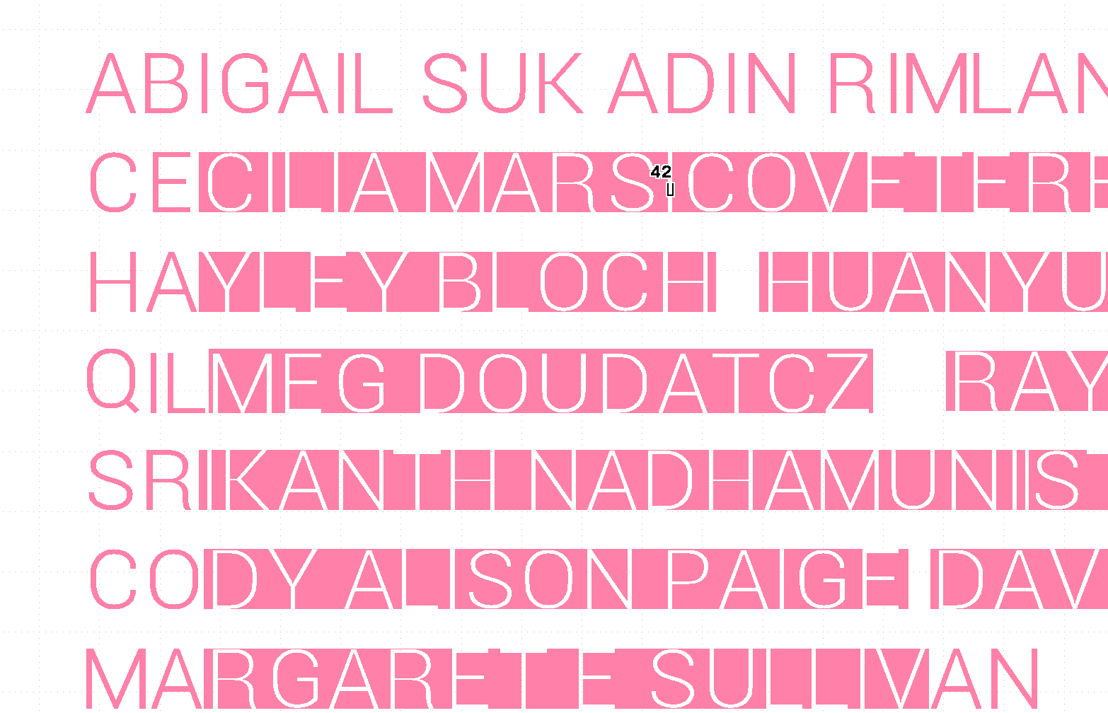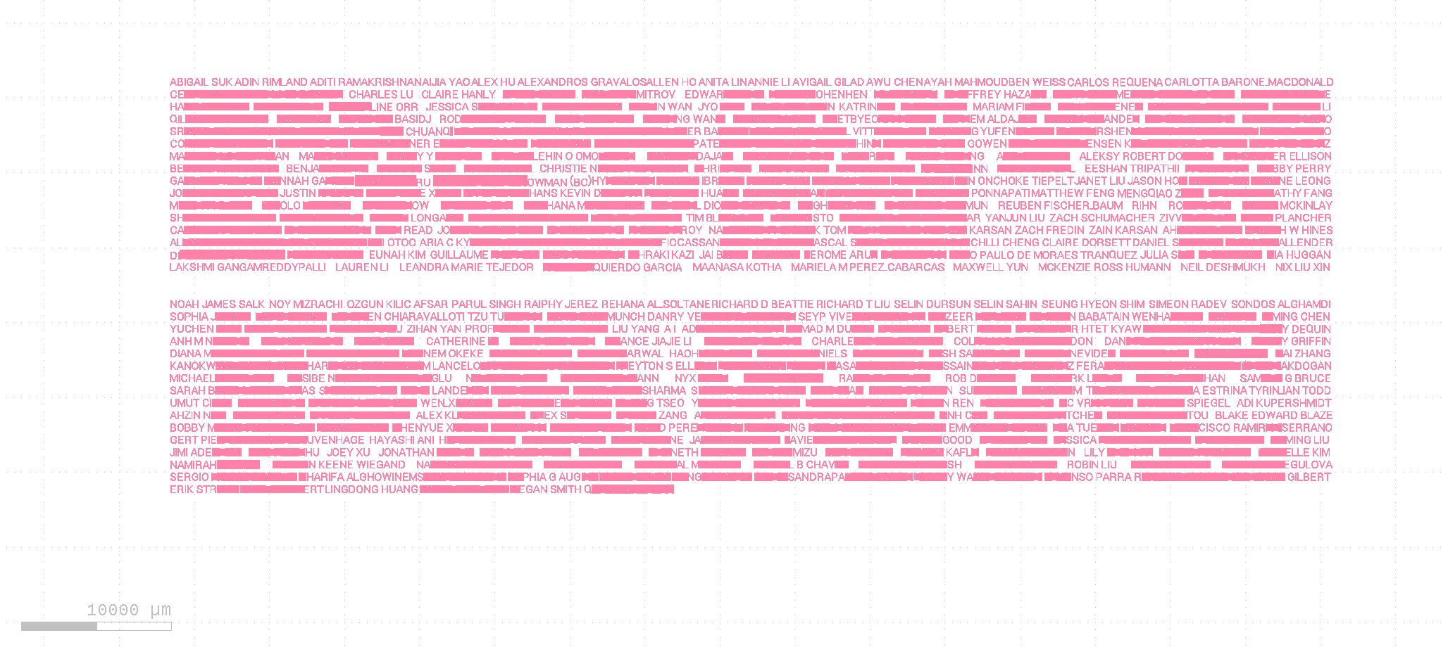 To estimate how many names will be used in this pattern, I wrote a scraper to parse through the "people" page of all the HTMAA website. Though I found many links have been eroded by time online, I still manage to pull down the full name list from 2008-2025 including all the students, TA, instrauctors, Gurus, etc. For names between 1998-2007, I just then manually collected them from different corners of the web. I also found the alumni name list for Fab Academy so collecting the names from this page is much easier. For HTMAA people, you can search your name here in the raw data. And by searching you may find some interesting coincidence of same names and same person/people repeatedly showing up in different years. To make the final version cleaner, I just kept one name in its latest occurence, e.g. Prof. Neil Gershenfeld's name would be only showing up once in 2025. After removing dubplicated names and adding 1730+ people from Fab Academy, it rounds up to ~3k names in total, this number will later be useful when coverting gds file.