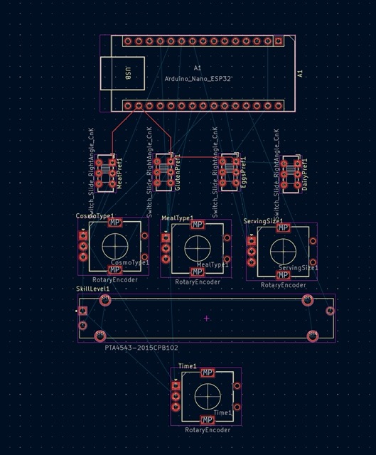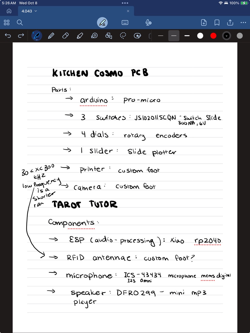To start, I thought of some board ideas, the first being a PCB for my thesis project, the Kitchen Cosmo, and a PCB for my final project idea for this class, a Tarot Tutor! I laid out the components and figured my thesis work would be a bit more tedious due to the amount of components. So to start, I took another look at the electrical components for the Tarot Tutor.